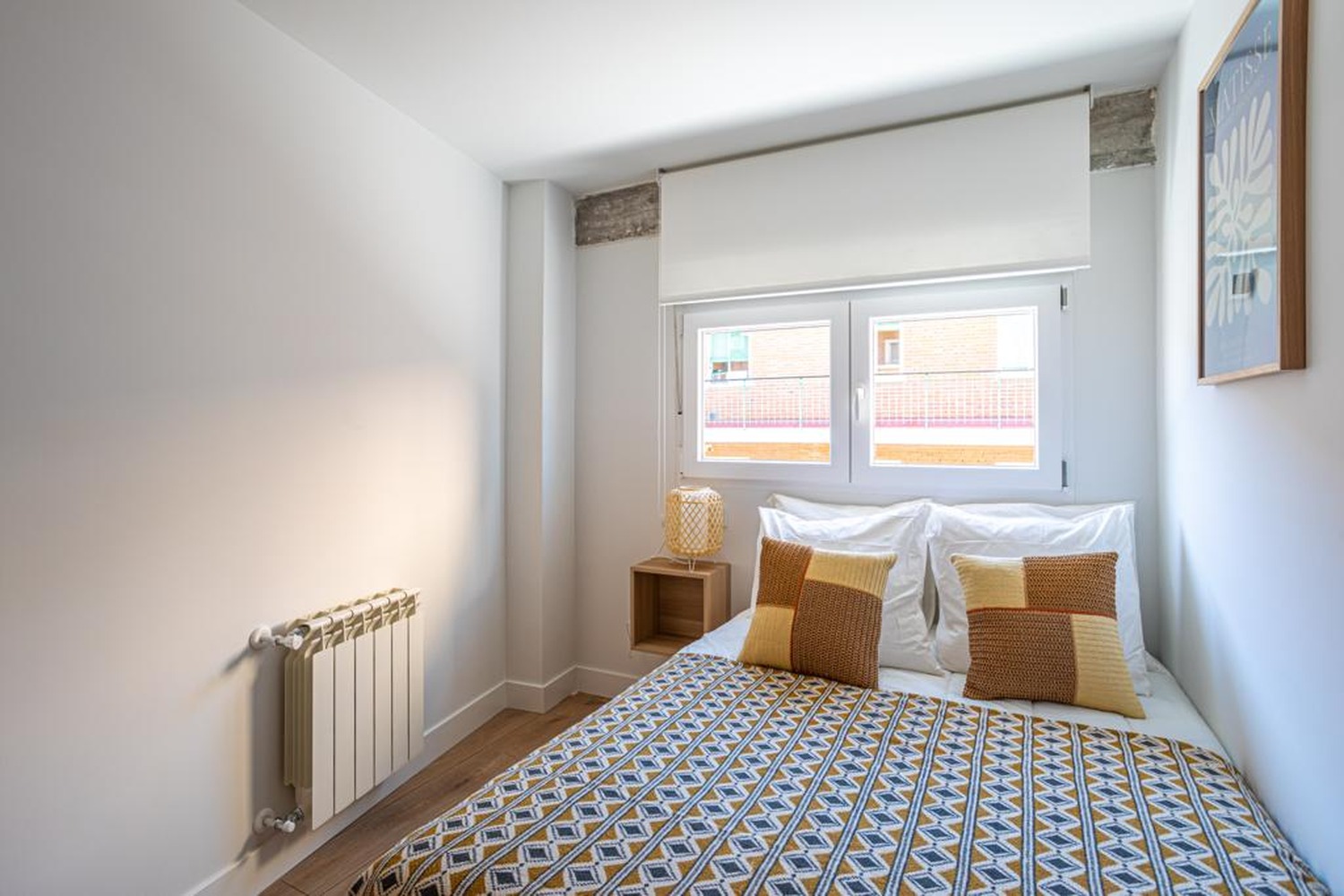La habitación es luminosa y está perfectamente equipada, con los siguientes complementos: 1 cama de 1,35 m con almohadas y cojines, juego de sábanas y edredón, mesita de noche con lámpara, un espacioso armario empotrado, calefacción por gas natural individual y cerramientos de doble cristal con las mejores calidades, todo esto decorado con buen gusto.