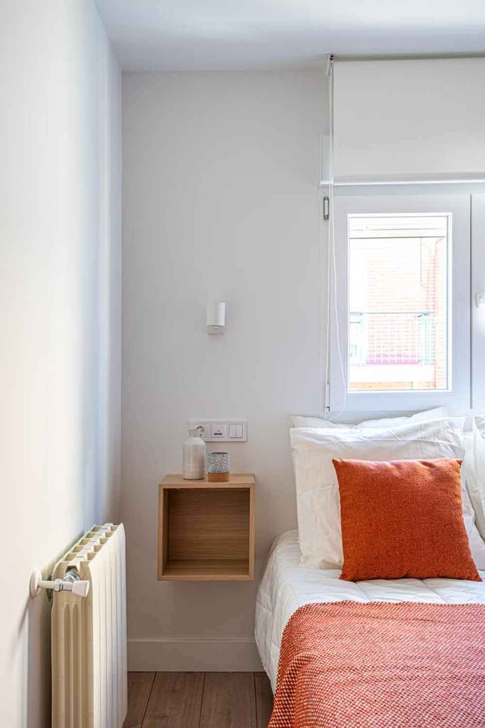 La habitación es luminosa y está perfectamente equipada, con los siguientes complementos: 1 cama de 1,35 m con almohadas y cojines, juego de sábanas y edredón, mesita de noche con lámpara, un espacioso armario empotrado, calefacción por gas natural individual y cerramientos de doble cristal con las mejores calidades, todo esto decorado con buen gusto.