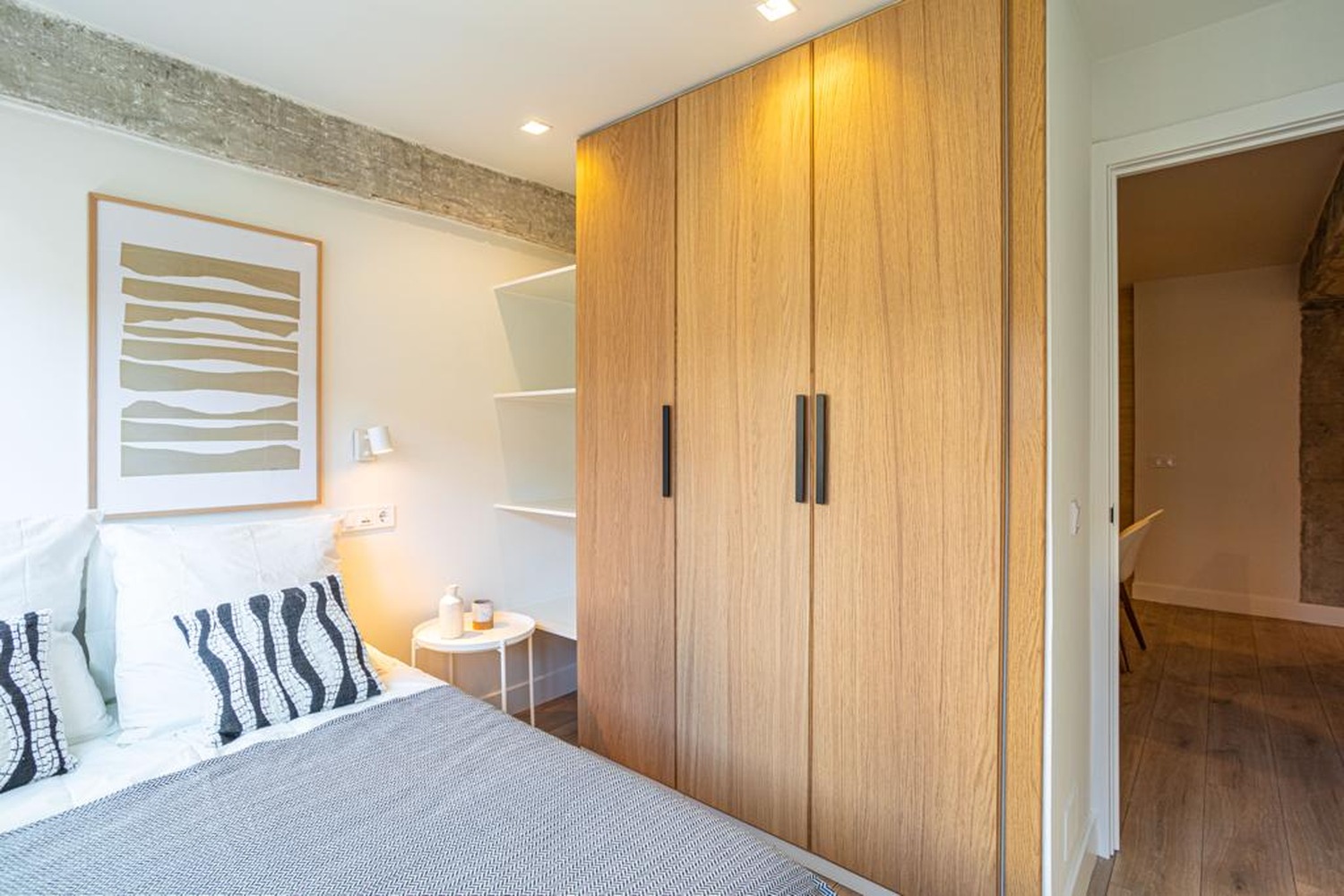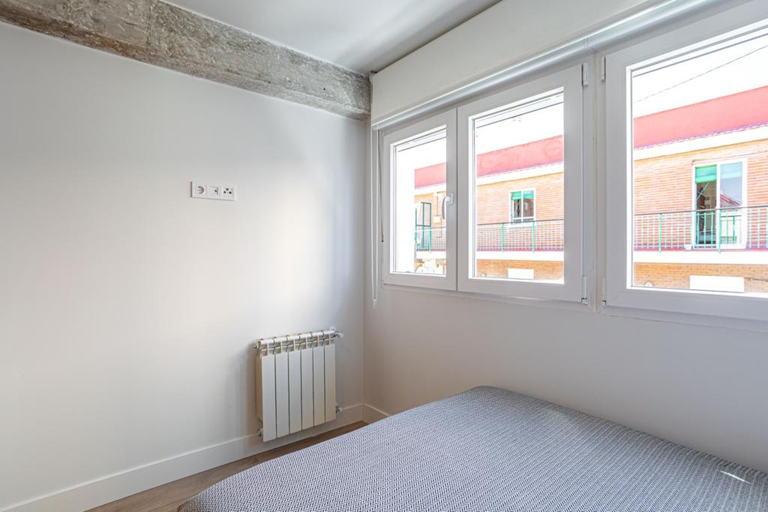 La habitación es luminosa y está perfectamente equipada, con los siguientes complementos: 1 cama de 1,35 m con almohadas y cojines, juego de sábanas y edredón, mesita de noche con lámpara, un espacioso armario empotrado, calefacción por gas natural individual y cerramientos de doble cristal con las mejores calidades, todo esto decorado con buen gusto.