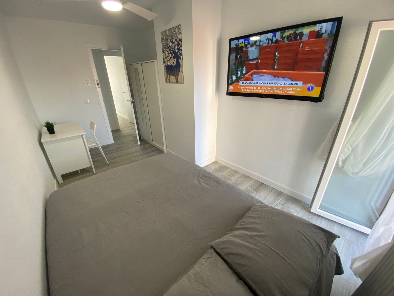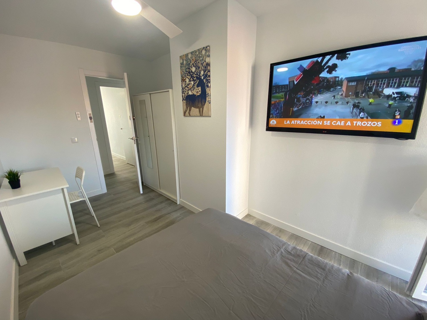 La habitación, con sus 12 m², es luminosa con una pequeña terraza privada, totalmente equipada para proporcionar confort y funcionalidad. Entre los complementos se incluye una smart tv, una confortable cama de 1.35 m, completa con almohadas, un juego de sábanas y un edredón para asegurar un descanso óptimo, todo a estrenar. Además, cuenta con un armario equipado con perchas, un escritorio de estudio diseñado para tus momentos de trabajo o estudio, y calefacción por gas natural y ventilador de techo para mantener un ambiente cálido y acogedor en todo momento.