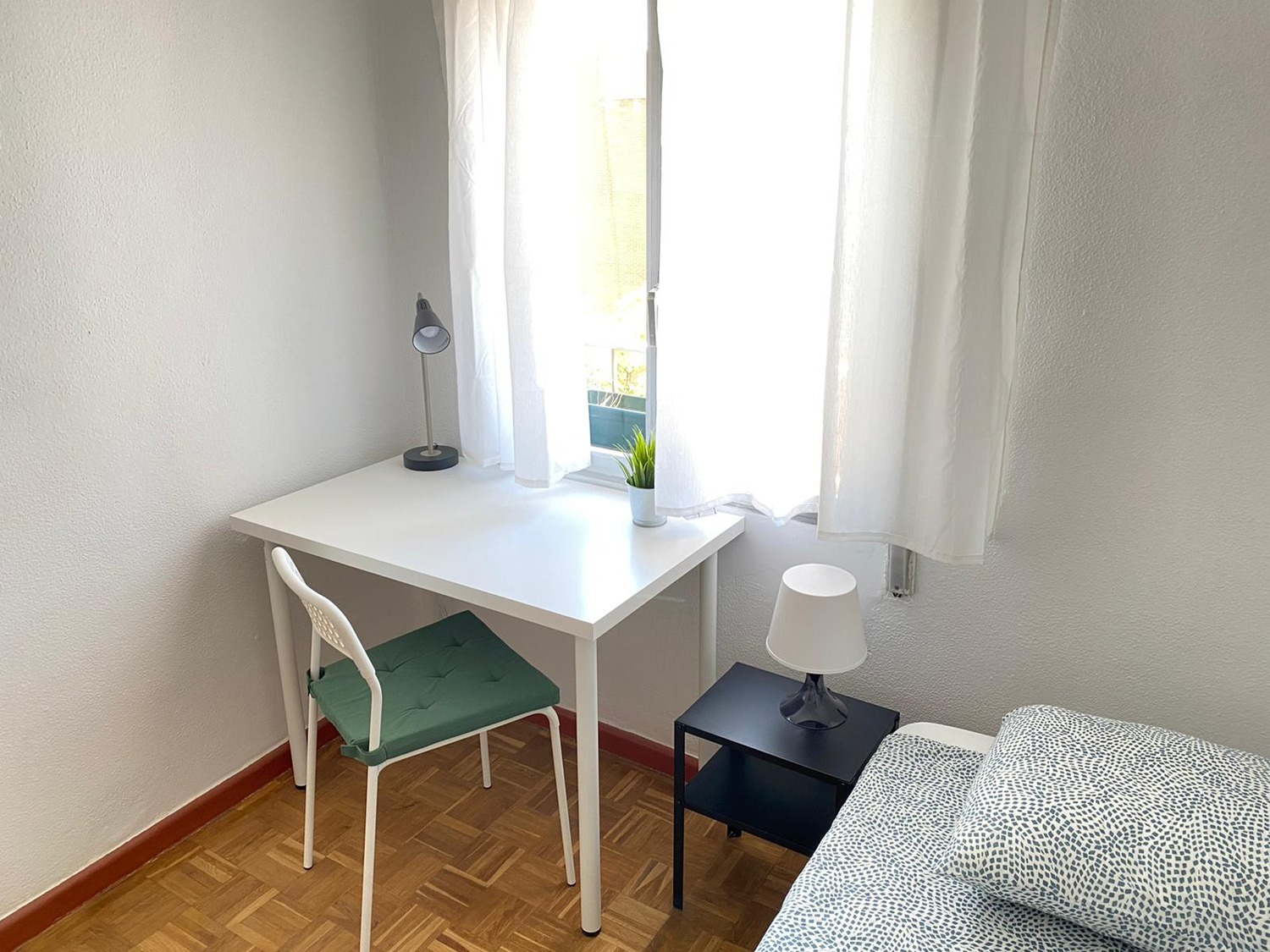 La habitación es luminosa y está perfectamente equipada, con los siguientes complementos: 1 cama de 0,90 m con almohada, juego de sábanas y edredón, mesita de noche con lámpara, armario, escritorio con silla, calefacción eléctrica. Todas las habitaciones incluyen conexión wifi por fibra de alta velocidad.