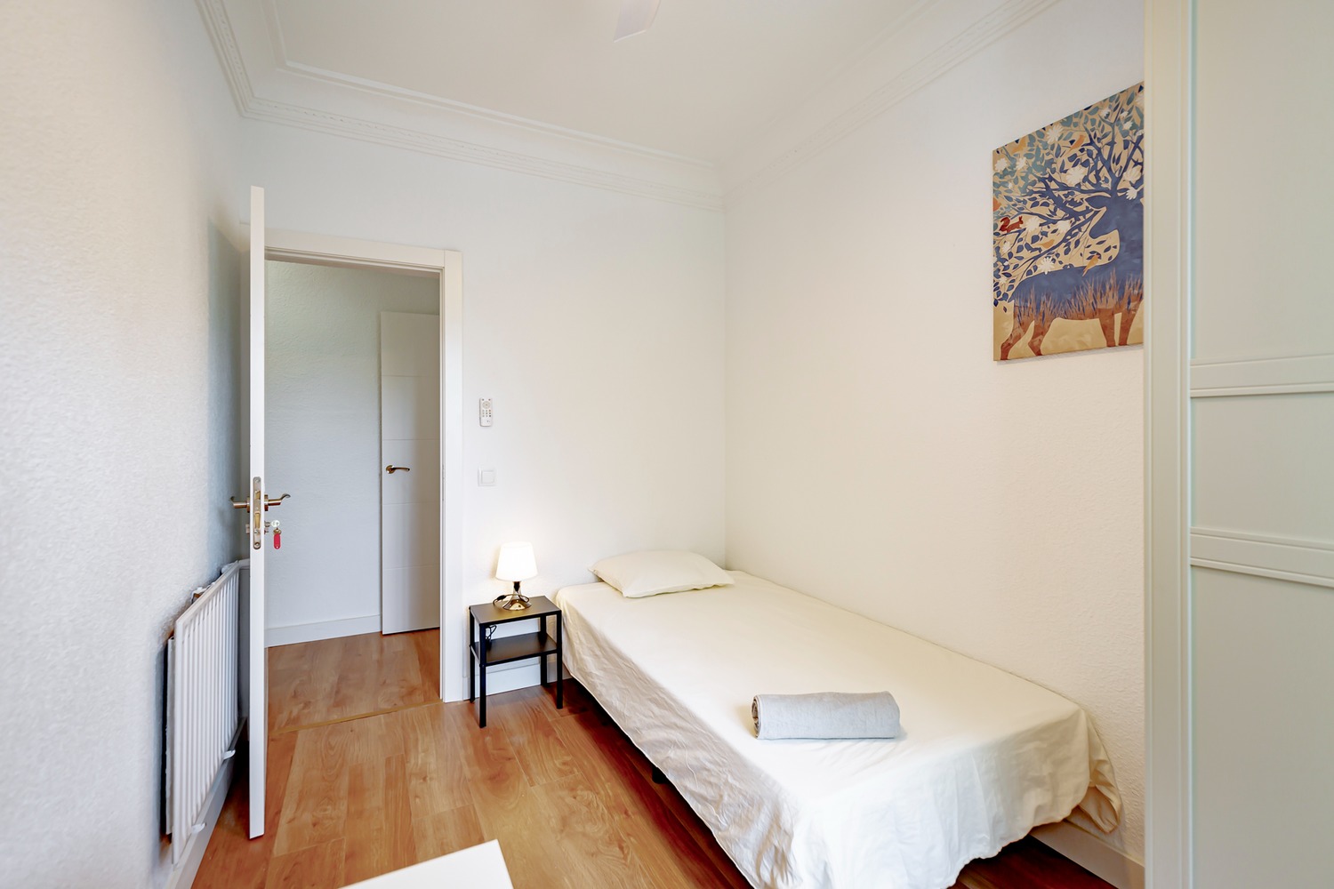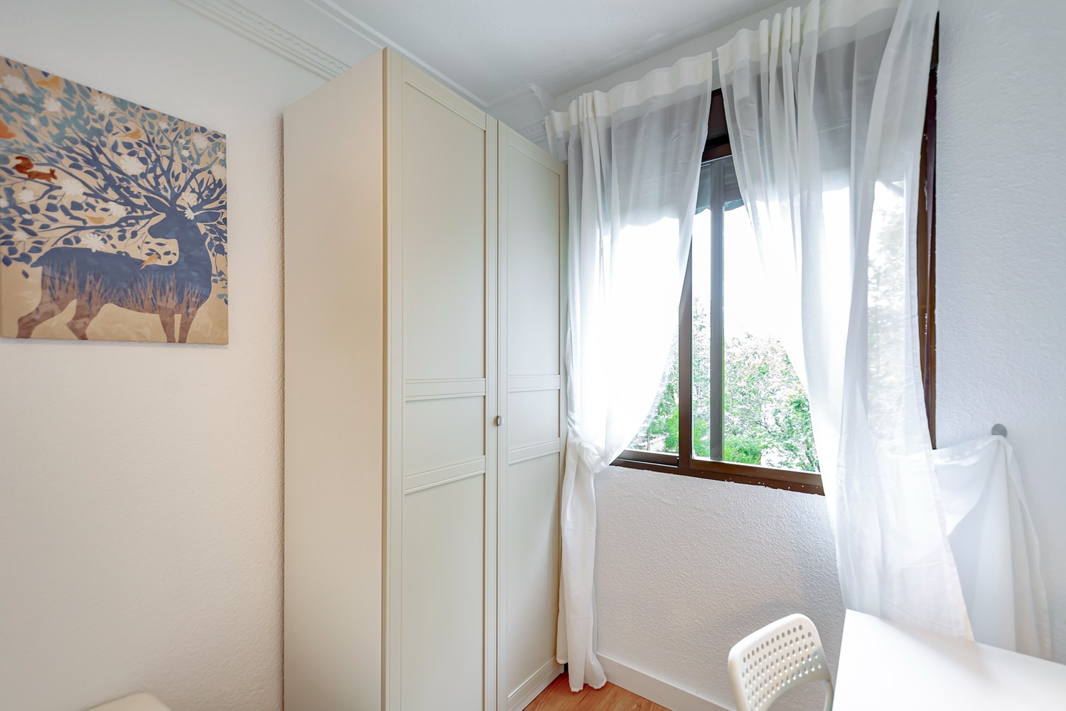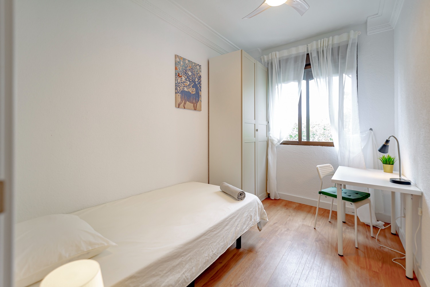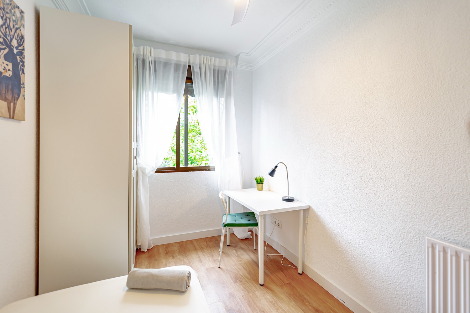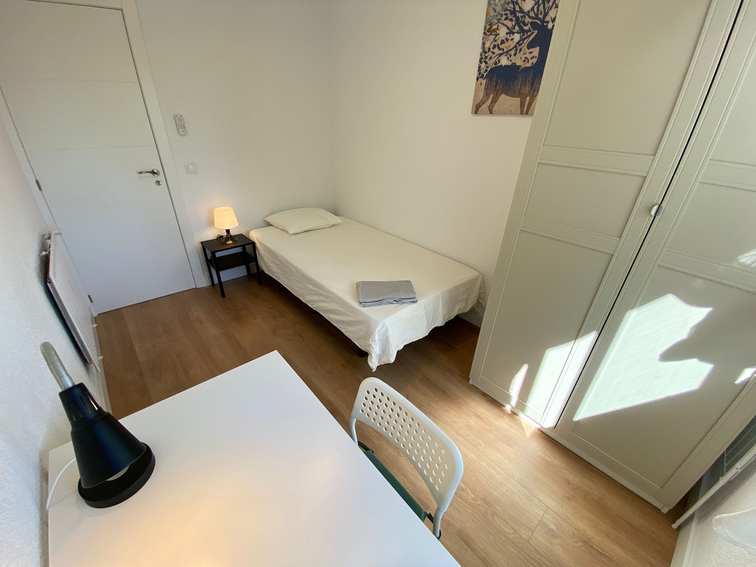 Estupenda habitación privada en alojamiento de estudiantes reformado en 2022. Alquilamos esta habitación privada, perfectamente acondicionada y con iluminación natural, con una superficie aproximada de 10m2. Para las horas de estudio, cuenta con un escritorio cómodo con flexo y una silla. El mobiliario se completa con un armario de 1,05m —en cuyo interior incluye una barra para las perchas—, una mesilla de noche y lámpara de techo, la cama de ancho 1.05 m. Se ha equipado adicionalmente con enchufes con puerto USB, ventilador de techo con mando a distancia y calefacción por gas natural.