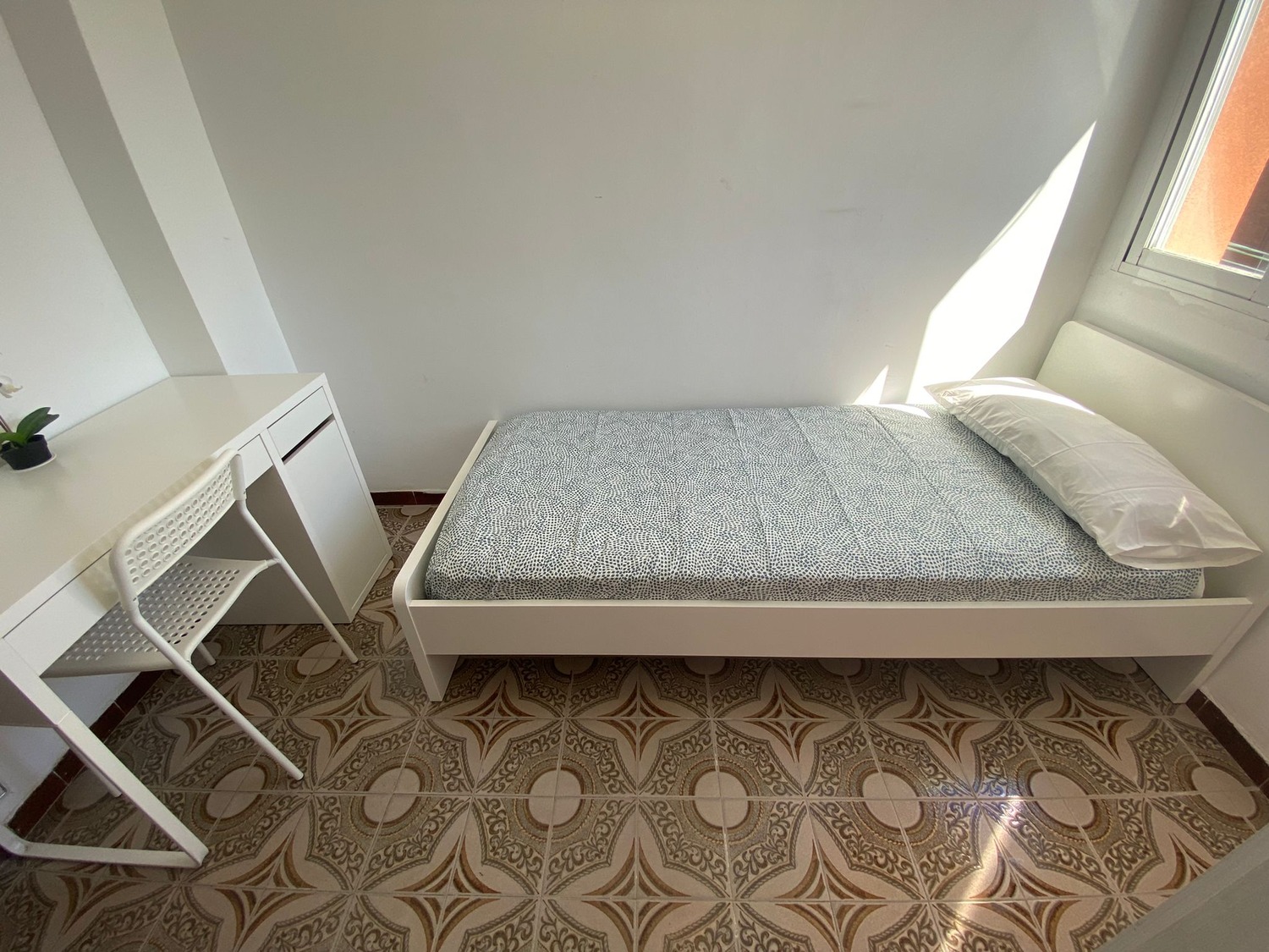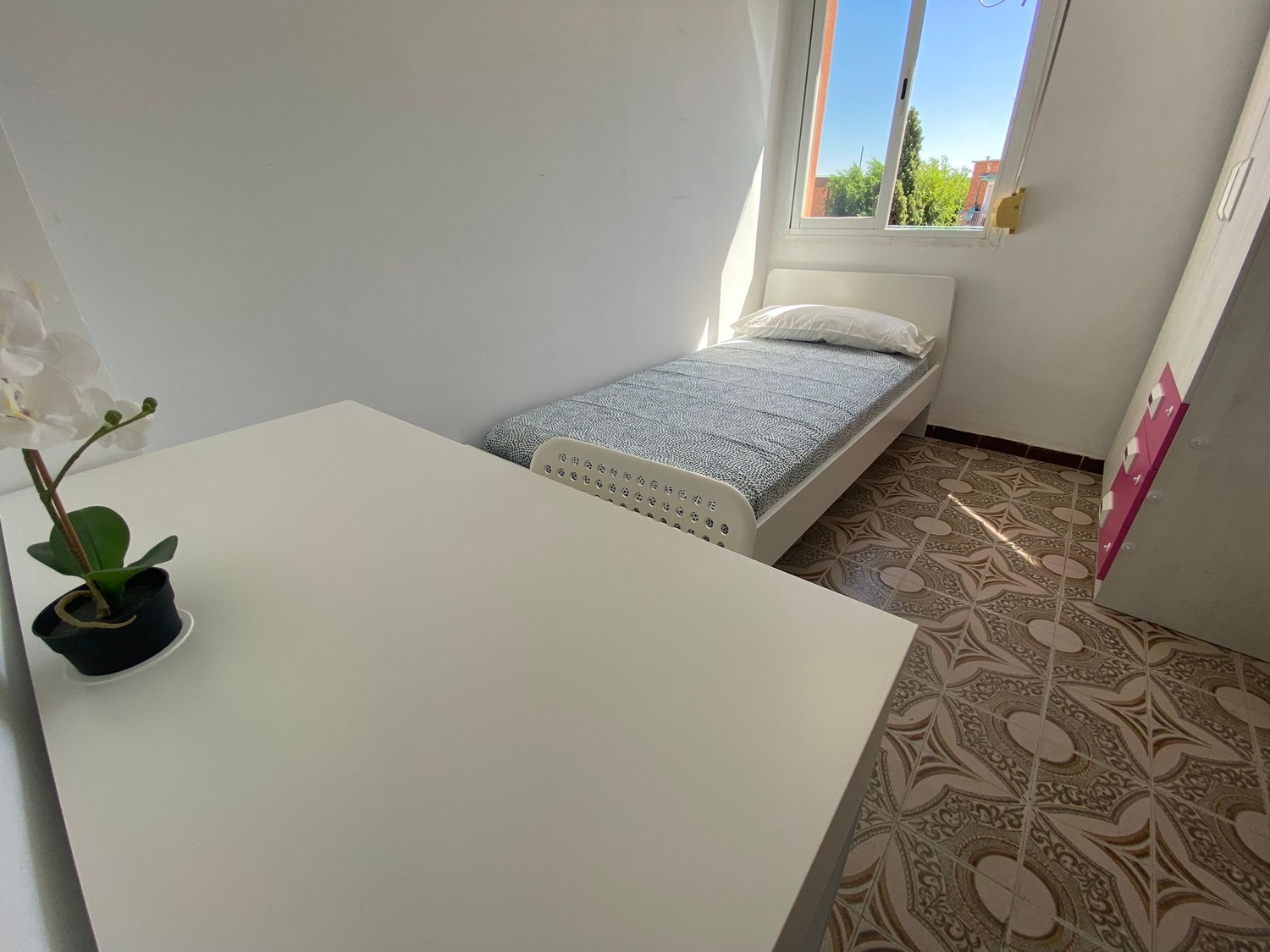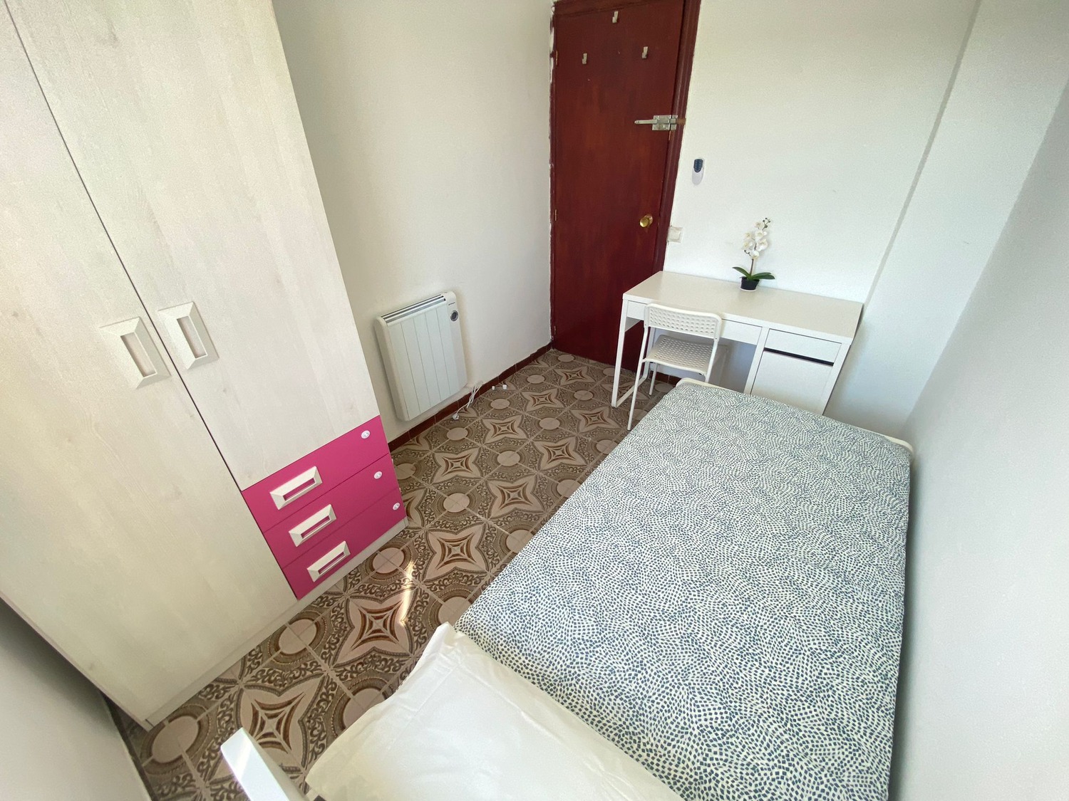 Alquilamos esta habitación privada, perfectamente acondicionada y con iluminación natural, con una superficie aproximada de 10m2. Cuenta con un escritorio cómodo con flexo, una silla de conferencia. El mobiliario se completa con un armario de 0,90m con espejo—en cuyo interior incluye una barra para las perchas— ventilador de techo con mando a distancia y calefacción eléctrica, la cama de ancho 0,90 m