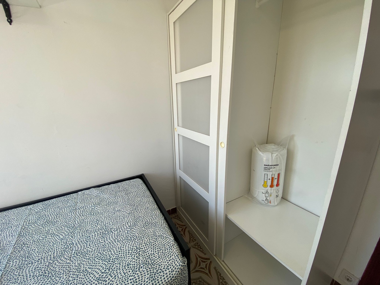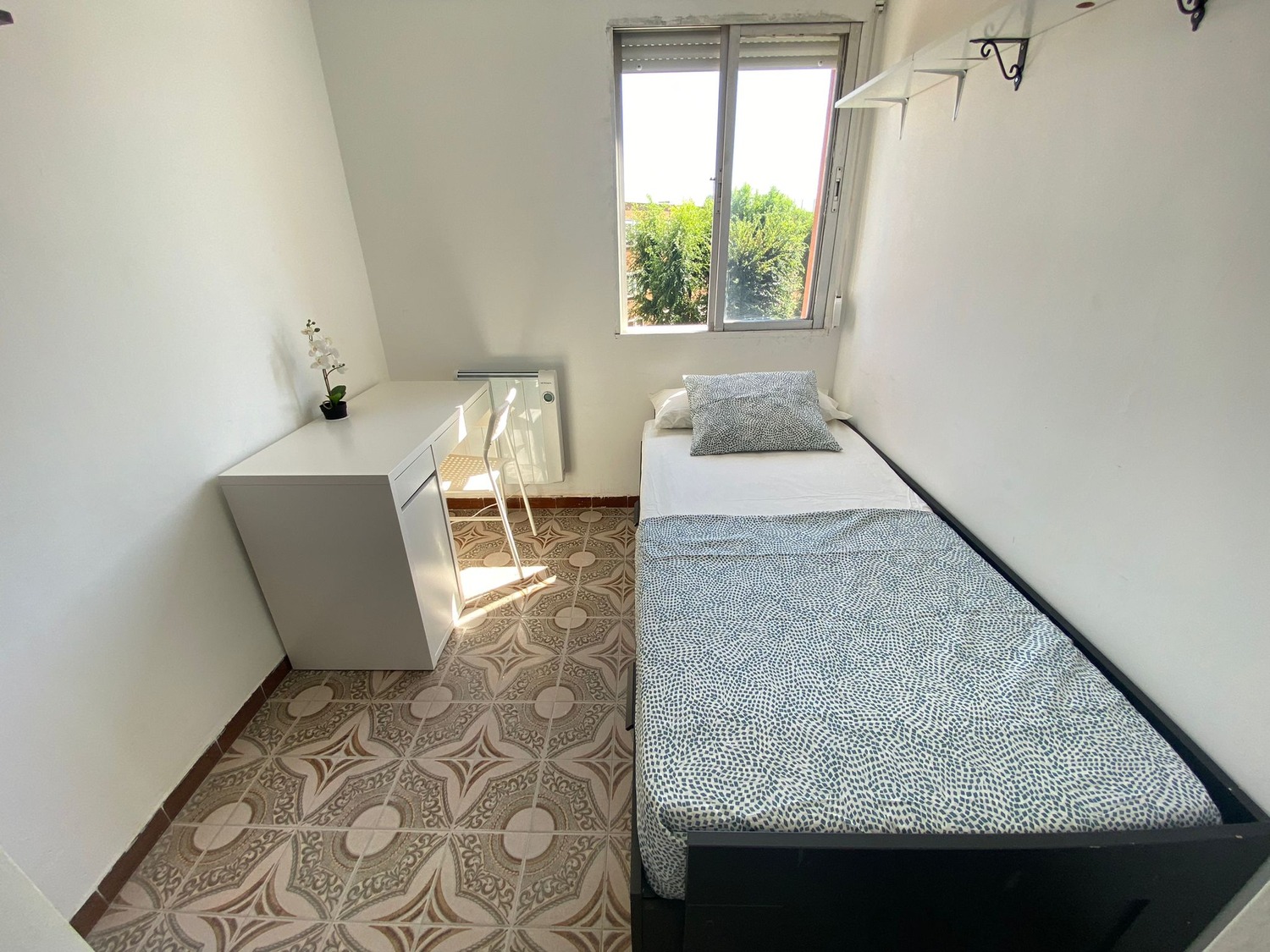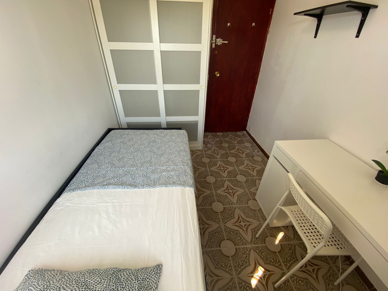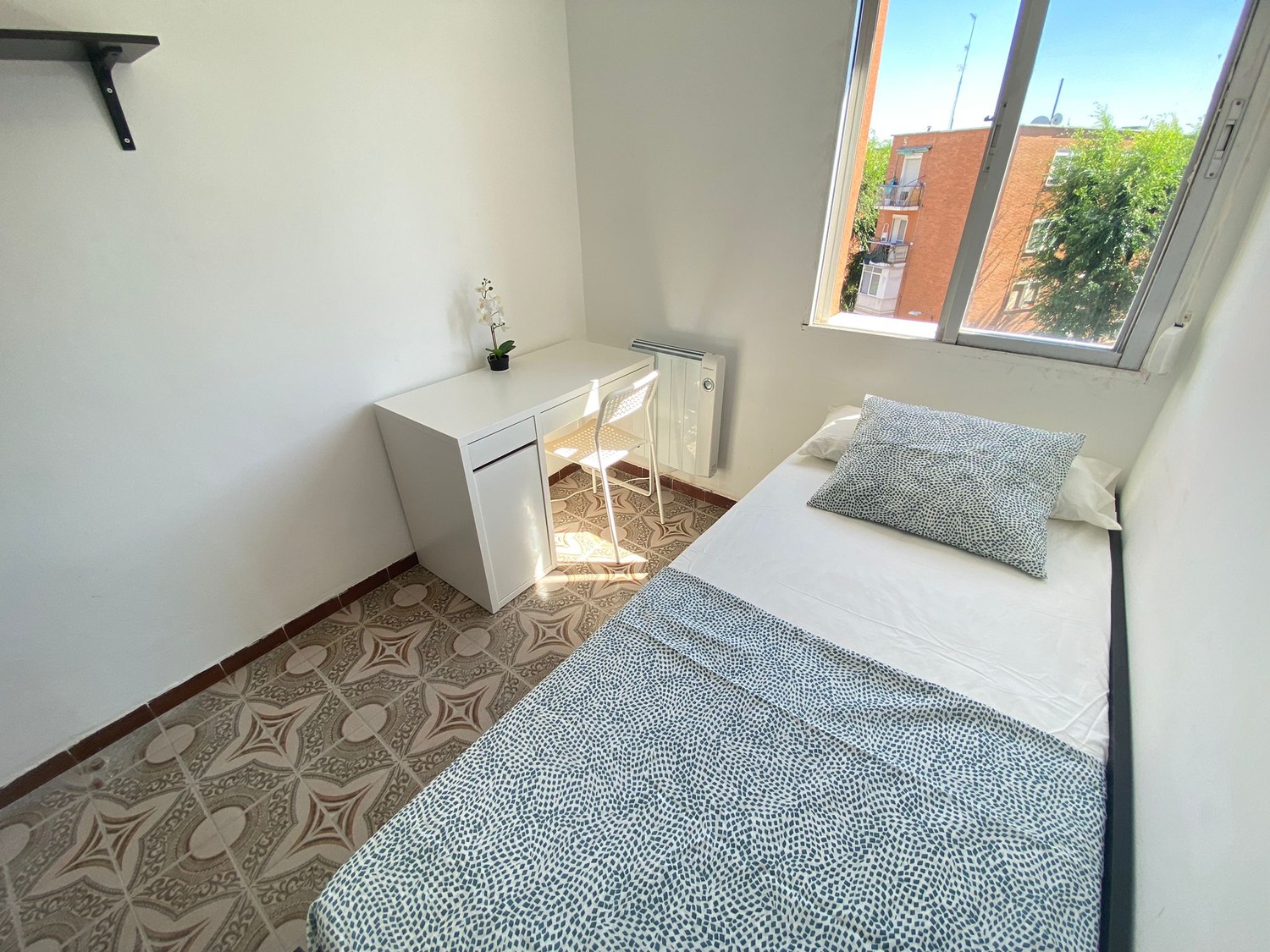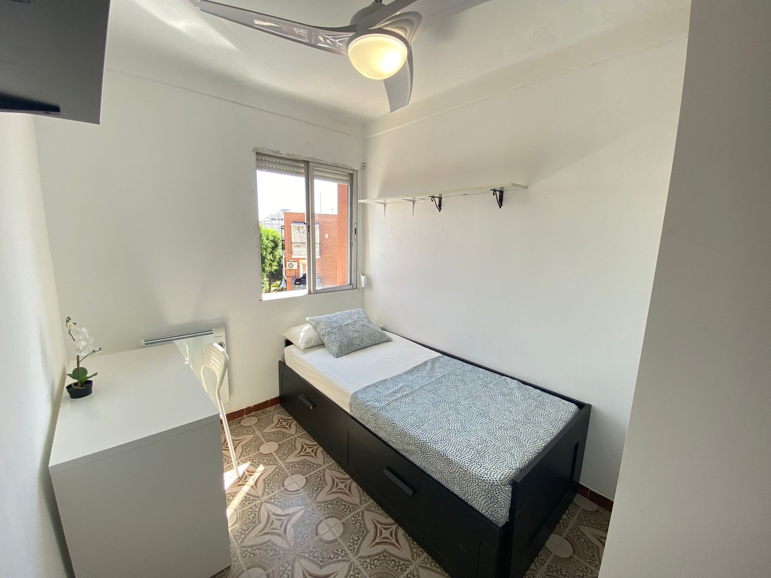 Alquilamos esta habitación privada, perfectamente acondicionada y con iluminación natural, con una superficie aproximada de 10m2. Cuenta con un escritorio cómodo con flexo, una silla de conferencia. El mobiliario se completa con un armario de 1,20m —en cuyo interior incluye una barra para las perchas— ventilador de techo con mando a distancia y calefacción eléctrica, la cama de ancho 0,90 m con 2 cajones amplios.