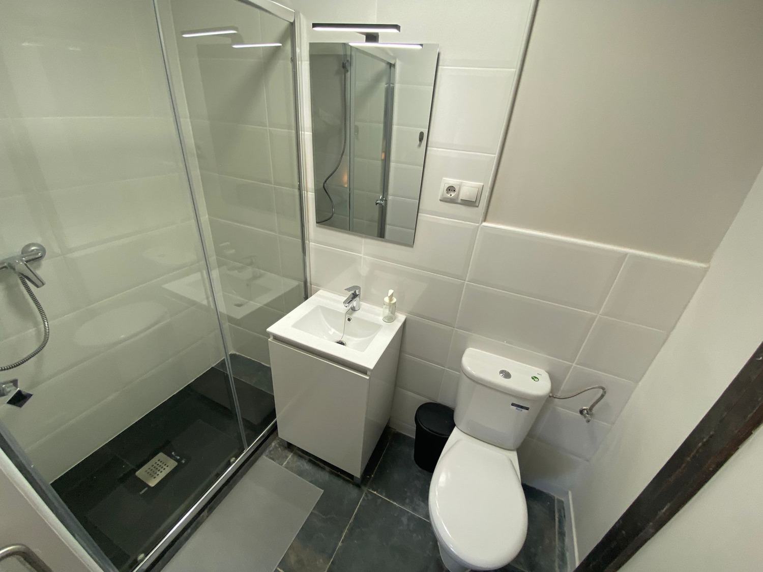 La habitación tiene una superficie de 15 m2, es luminosa y está perfectamente equipada, con los siguientes complementos: 1 cama de 1.35 m con almohadas y cojines, juego de sábanas y edredón, mesilla de noche con lámpara, un espacioso armario, aire acondicionado con horario regulado, escritorio de estudio, nevera privada, calefacción por gas natural individual y cerramientos de doble cristal con las mejores calidades. Todas las habitaciones incluyen cerradura con llave privada conexión wifi por fibra de alta velocidad. Gastos incluidos en el precio. Esta habitación dispone de baño privado en suite, con lavabo, váter y plato de ducha.