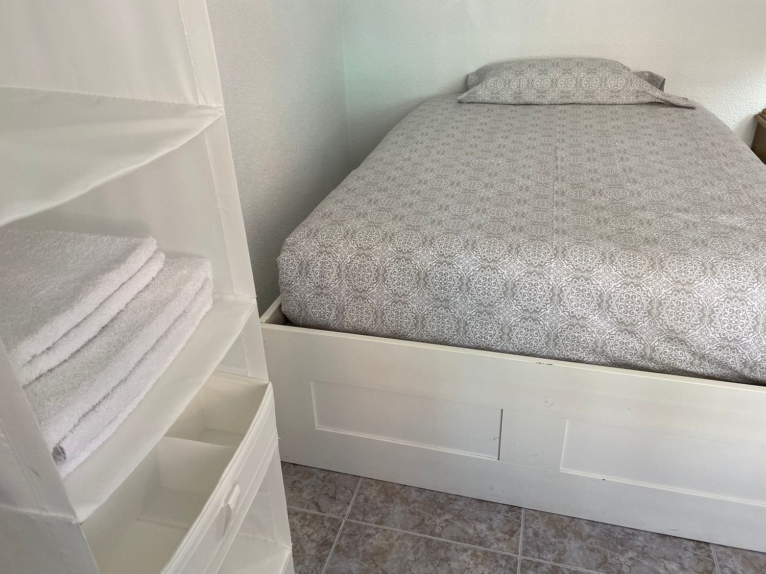 La habitación es luminosa y está perfectamente equipada, con los siguientes complementos: 1 cama de 1.05 m con almohada, juego de sábanas y edredón, mesita de noche con lámpara, armario abierto color blanco