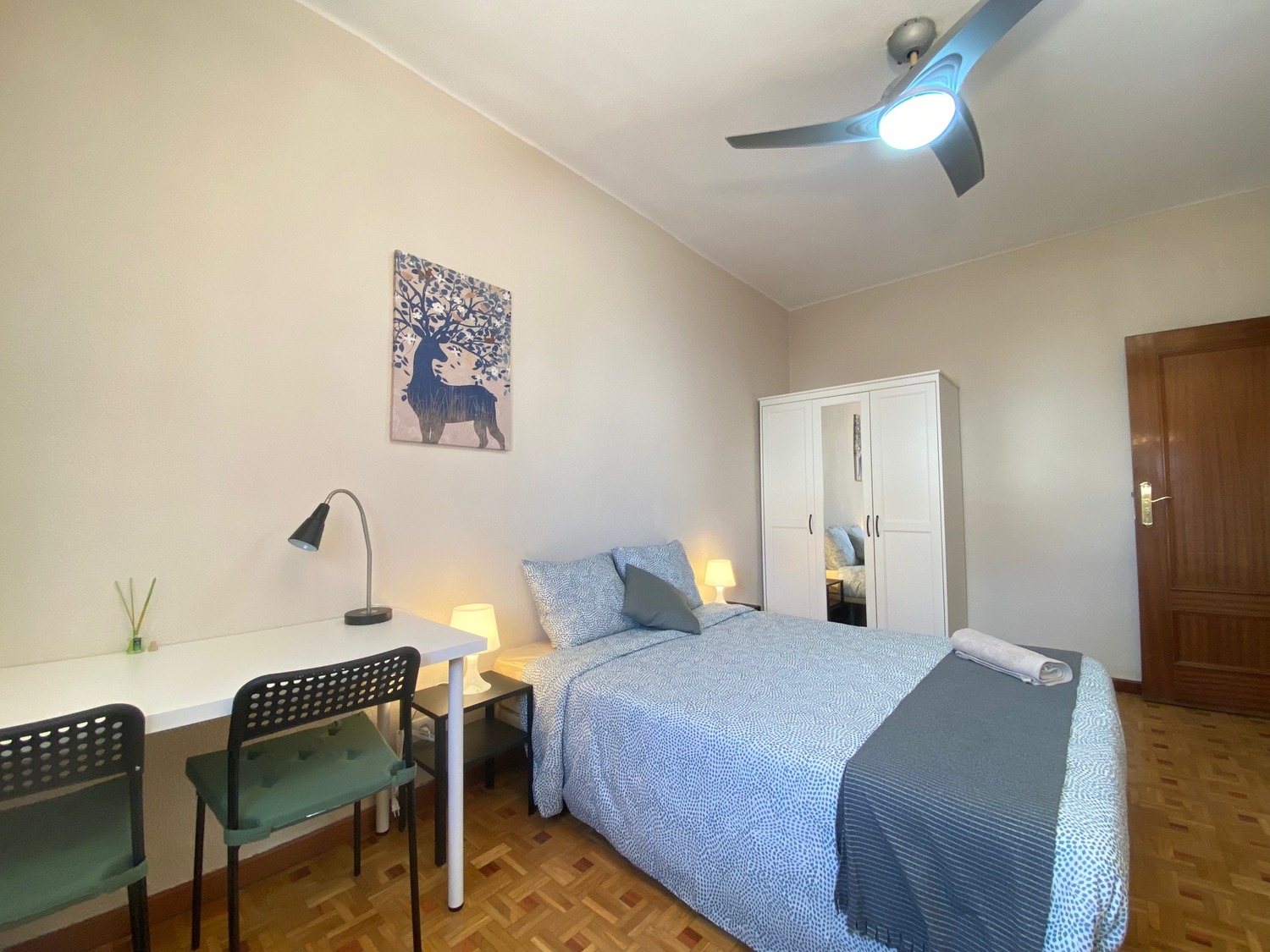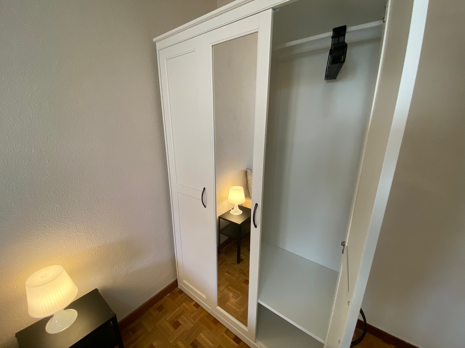 La habitación es luminosa y está perfectamente equipada, con los siguientes complementos: 1 cama de 1,35 m con almohadas y cojines, juego de sábanas y edredón, doble mesita de noche con lámpara, un espacioso armario, calefacción por gas natural individual y cerramientos de doble cristal con las mejores calidades. Incluye Nevera propia.