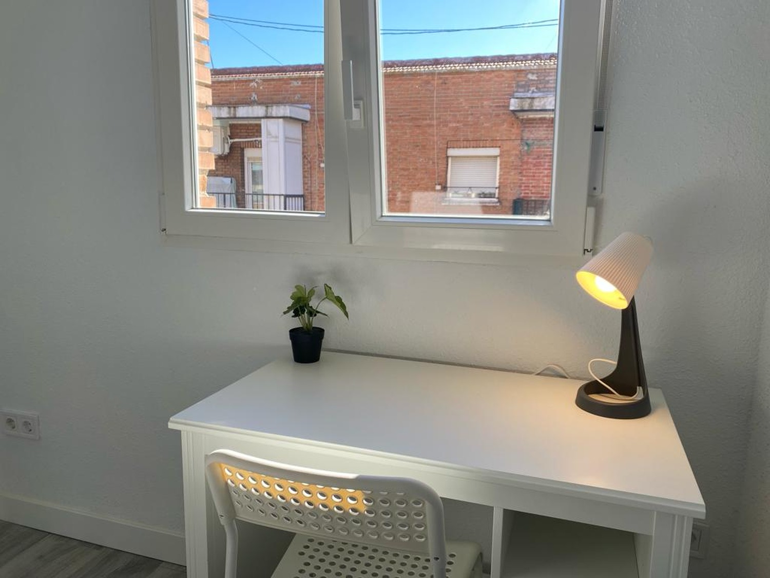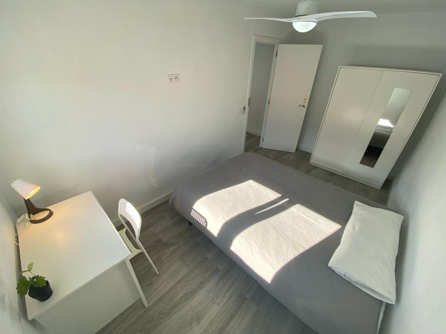 Alquilamos esta habitación privada DOBLE, perfectamente acondicionada y con iluminación natural, con una superficie aproximada de 15m2. Cuenta con un escritorio cómodo y una silla. El mobiliario se completa con un armario —en cuyo interior incluye una barra para las perchas— ventilador de techo con mando a distancia y calefacción por eléctrica, la cama de ancho de 1,35 m.