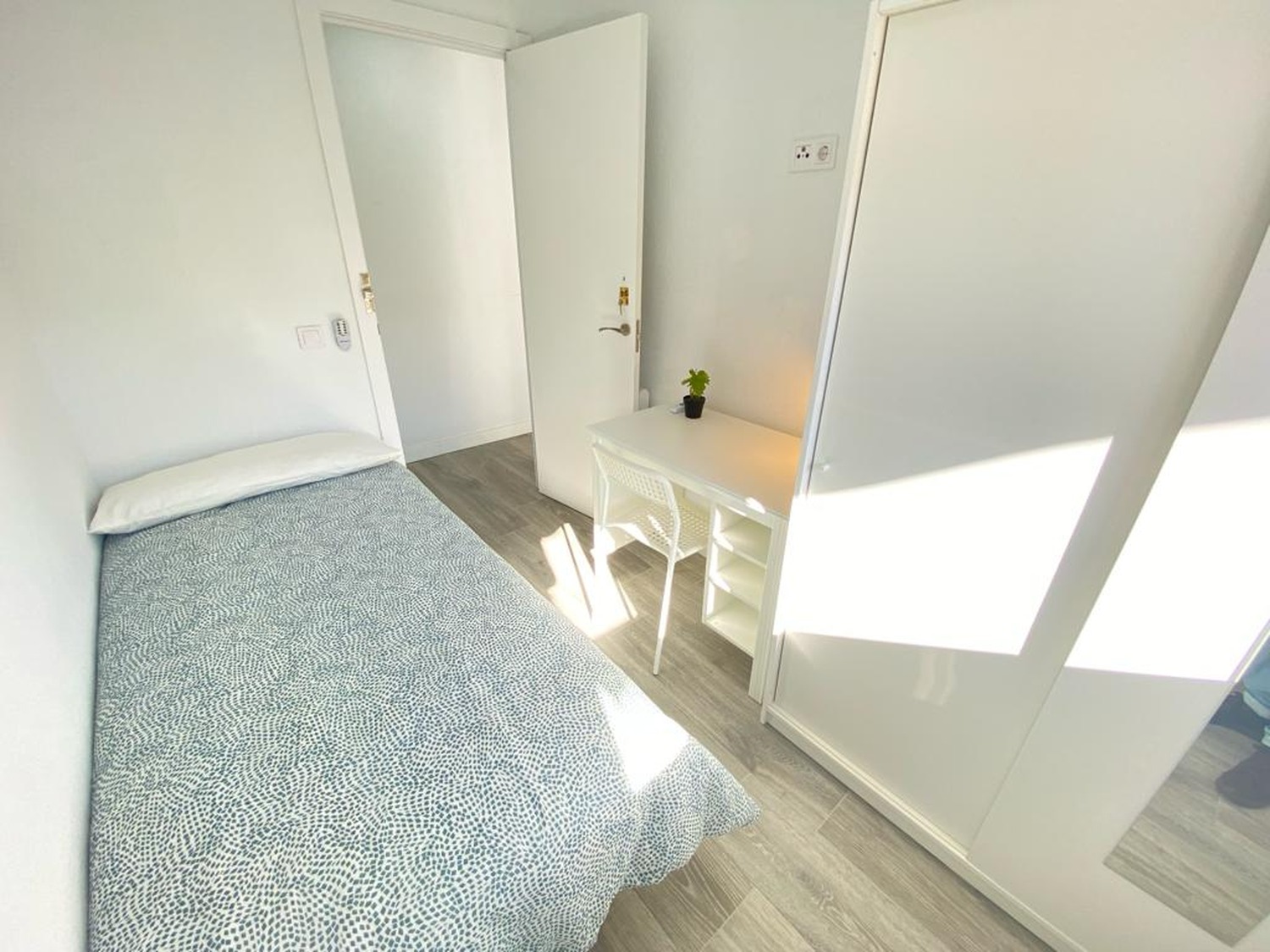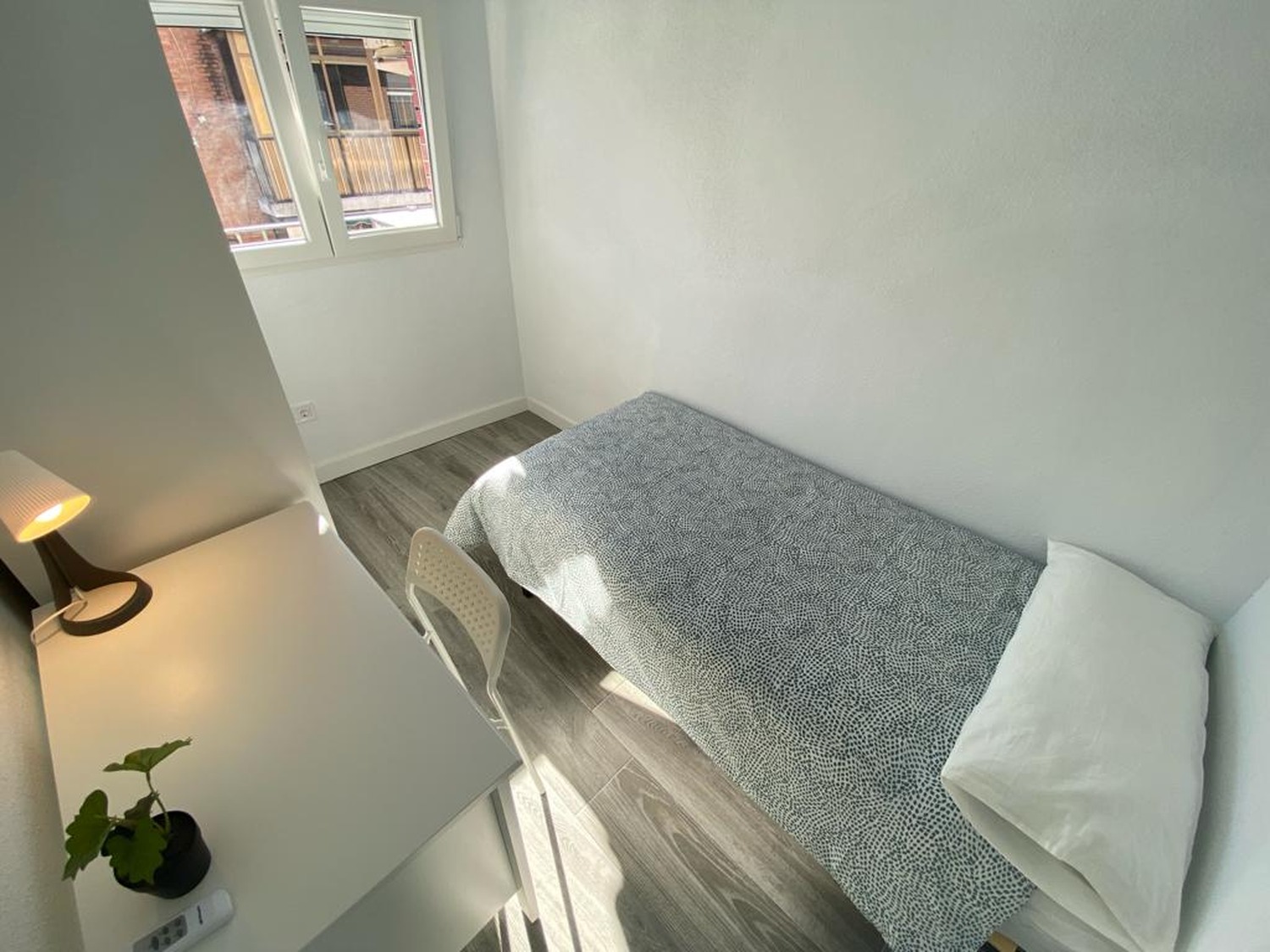 Alquilamos esta habitación privada INDIVIDUAL, perfectamente acondicionada y con iluminación natural, con una superficie aproximada de 15m2. Cuenta con un escritorio cómodo y una silla. El mobiliario se completa con un armario —en cuyo interior incluye una barra para las perchas— ventilador de techo con mando a distancia y calefacción por eléctrica, la cama de ancho de 1,35 m.