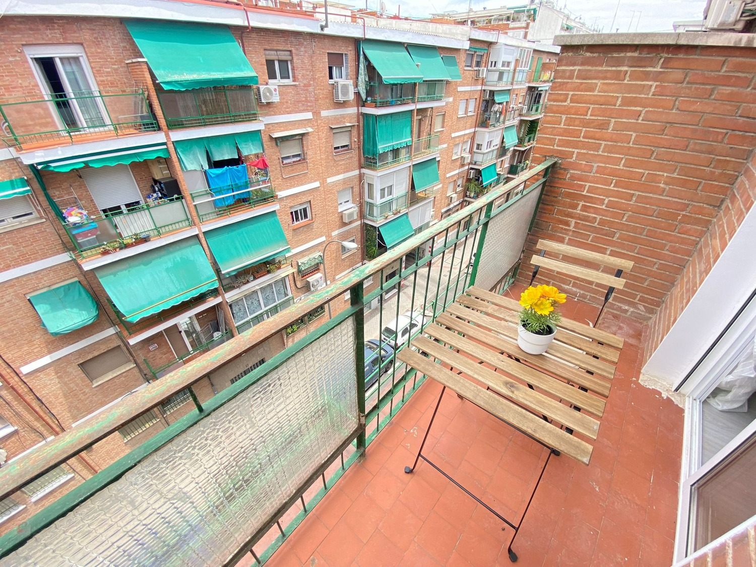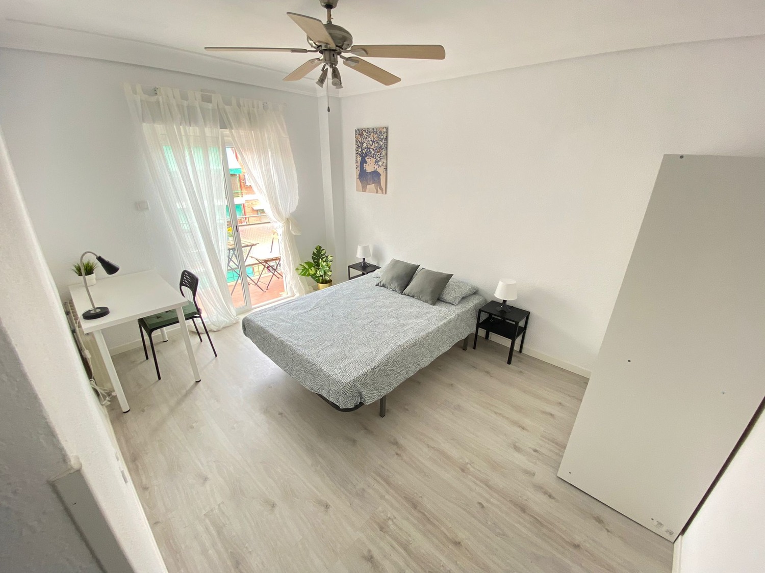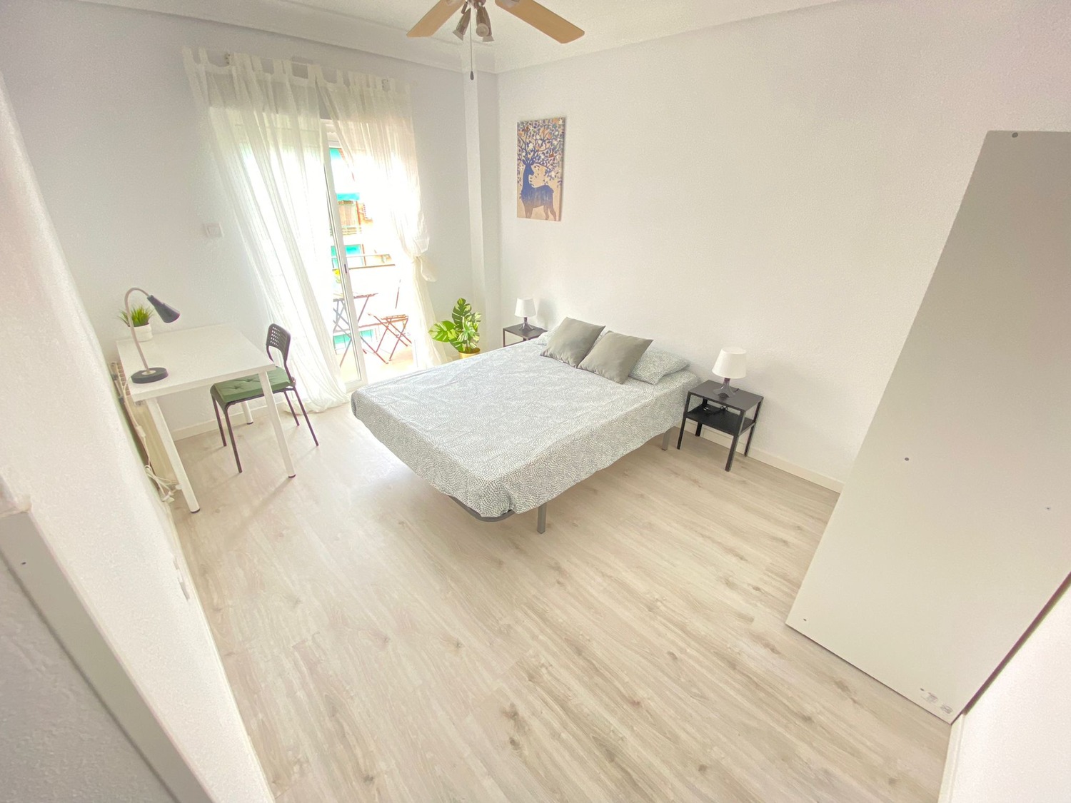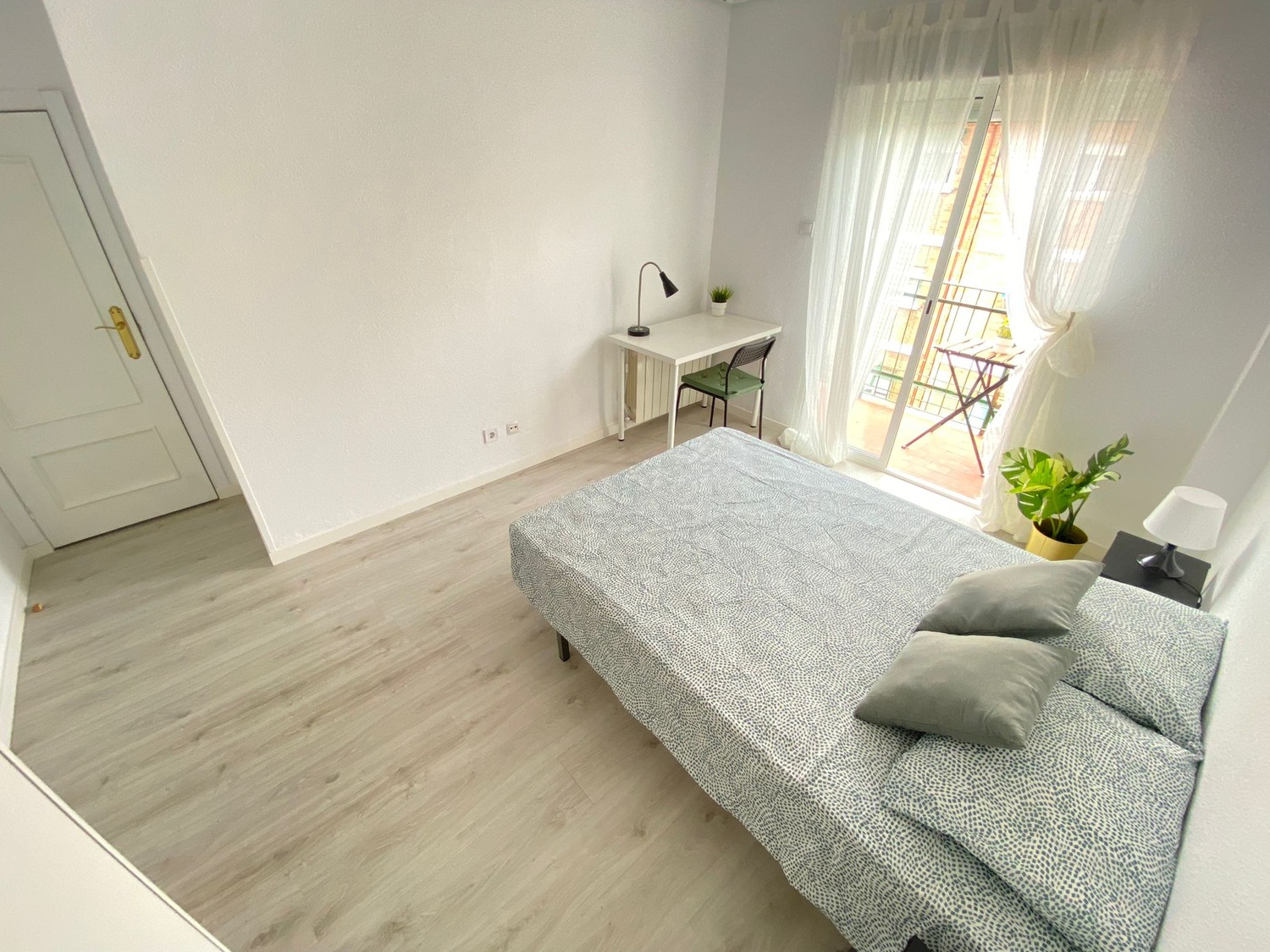 Habitación con terraza, muy luminosa. Está perfectamente equipada, con los siguientes complementos: cama de 1.35 m con almohada, ropa de cama al completo, edredón, mesita de noche con lámpara, armario, escritorio con silla, calefacción por gas natural.