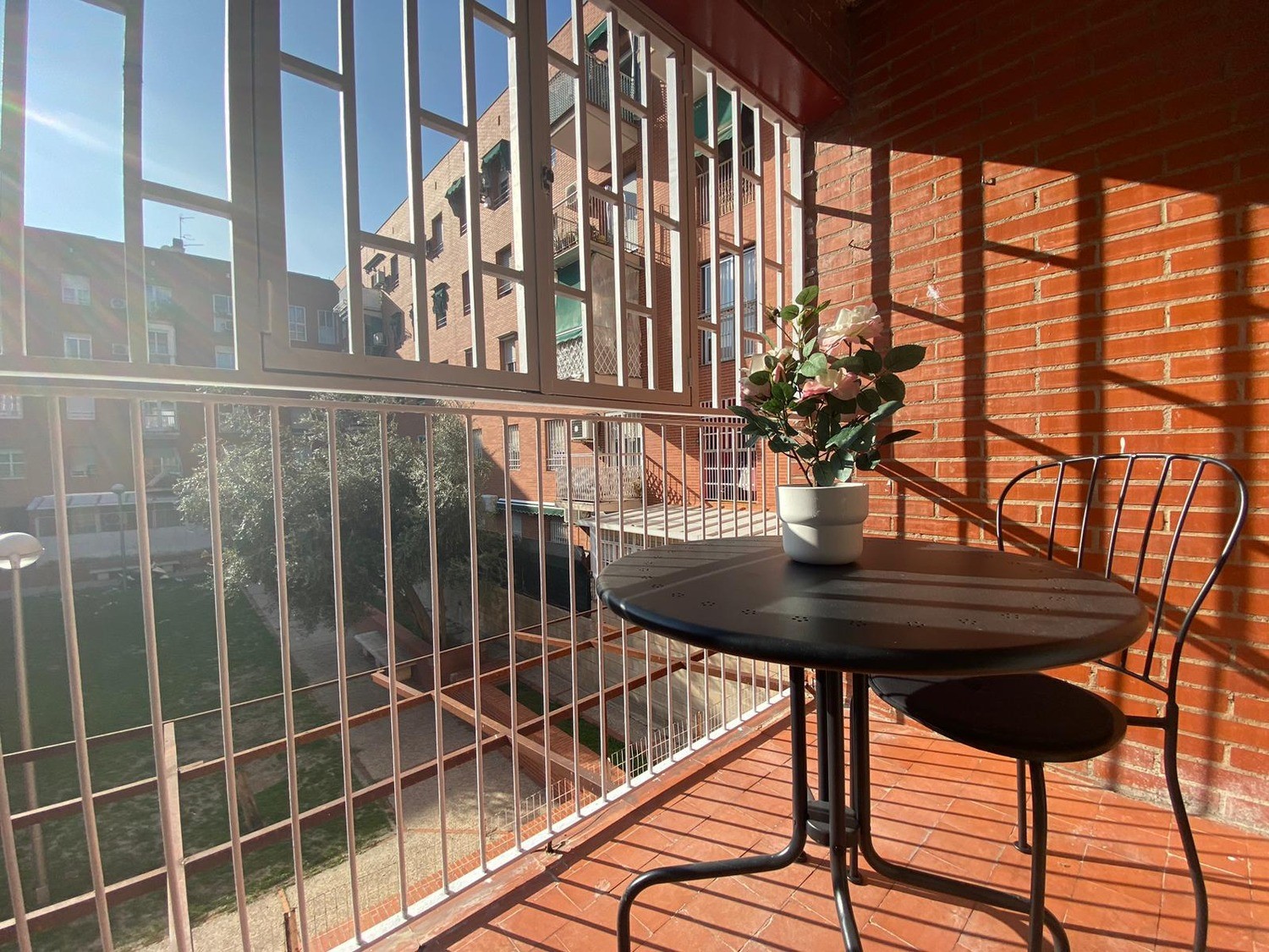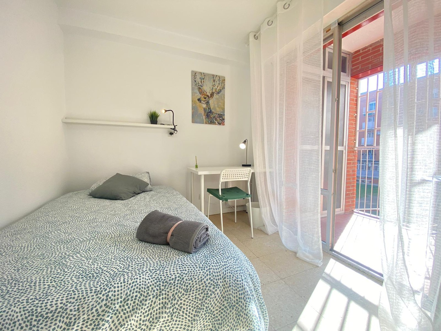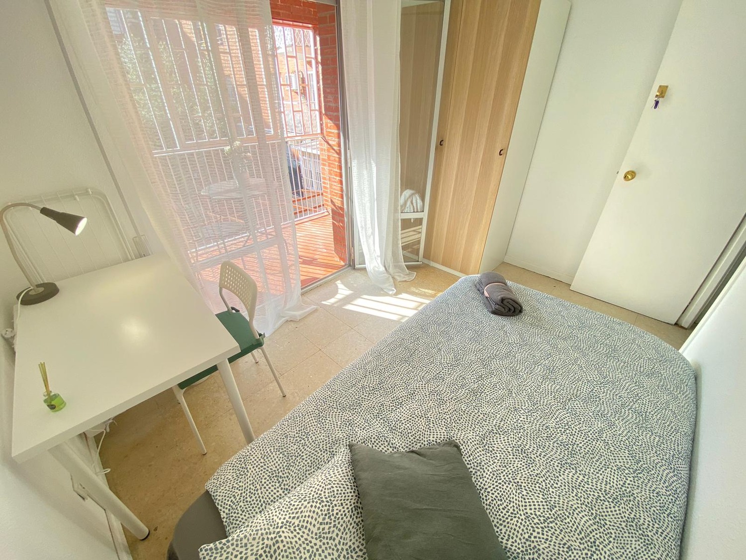 En la publicación podemos apreciar esta hermosa habitación INDIVIDUAL es exterior, luminosa y está perfectamente equipada con los siguientes complementos: 1 cama de 1,05 m con almohadas, juego de sábanas, toalla y edredón, escritorio de trabajo o estudio, balda con lámpara, varios enchufes y un espacioso armario, calefacción individual eléctrica, terraza con buenos cerramientos y ventilador de techo.