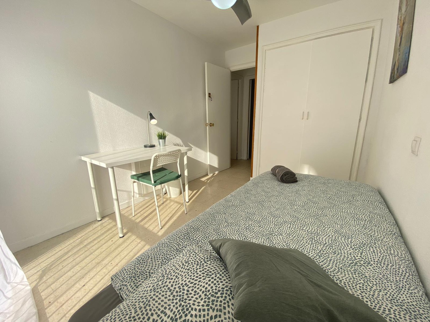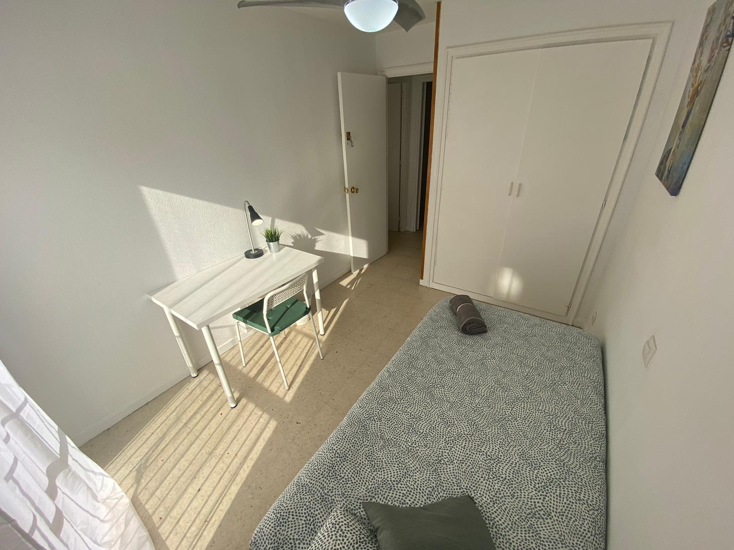 En la publicación podemos apreciar esta hermosa habitación INDIVIDUAL es exterior, luminosa y está perfectamente equipada con los siguientes complementos: 1 cama de 1,05 m con almohadas, juego de sábanas, toalla y edredón, escritorio de trabajo o estudio, balda con lámpara, varios enchufes y un espacioso armario, calefacción individual eléctrica y ventilador de techo.