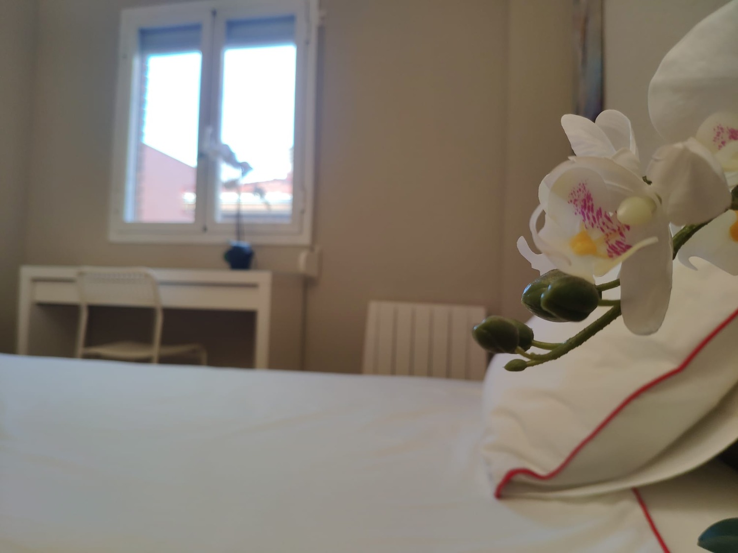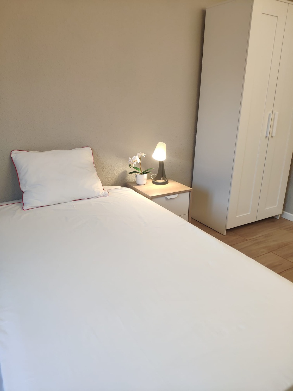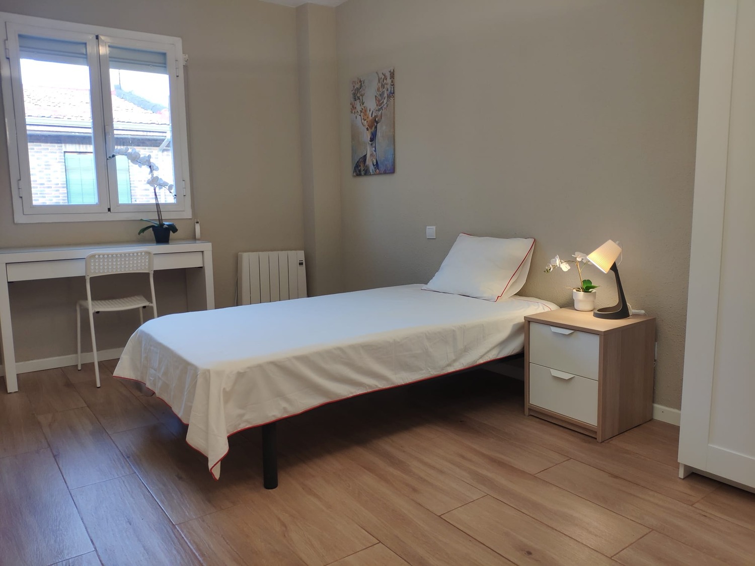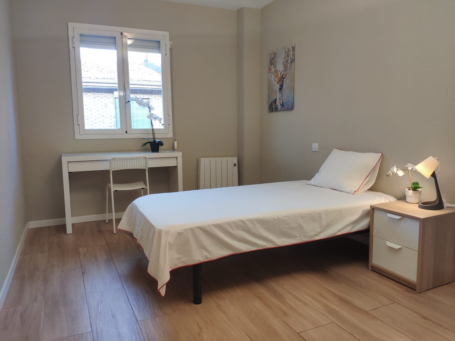 La habitación es luminosa y está perfectamente equipada, con los siguientes complementos: 1 cama de 1,05 cms con almohada, juego de sábanas y edredón, mesita de noche con lámpara, armario, escritorio con silla, perchero de pared, calefacción eléctrica y terraza.