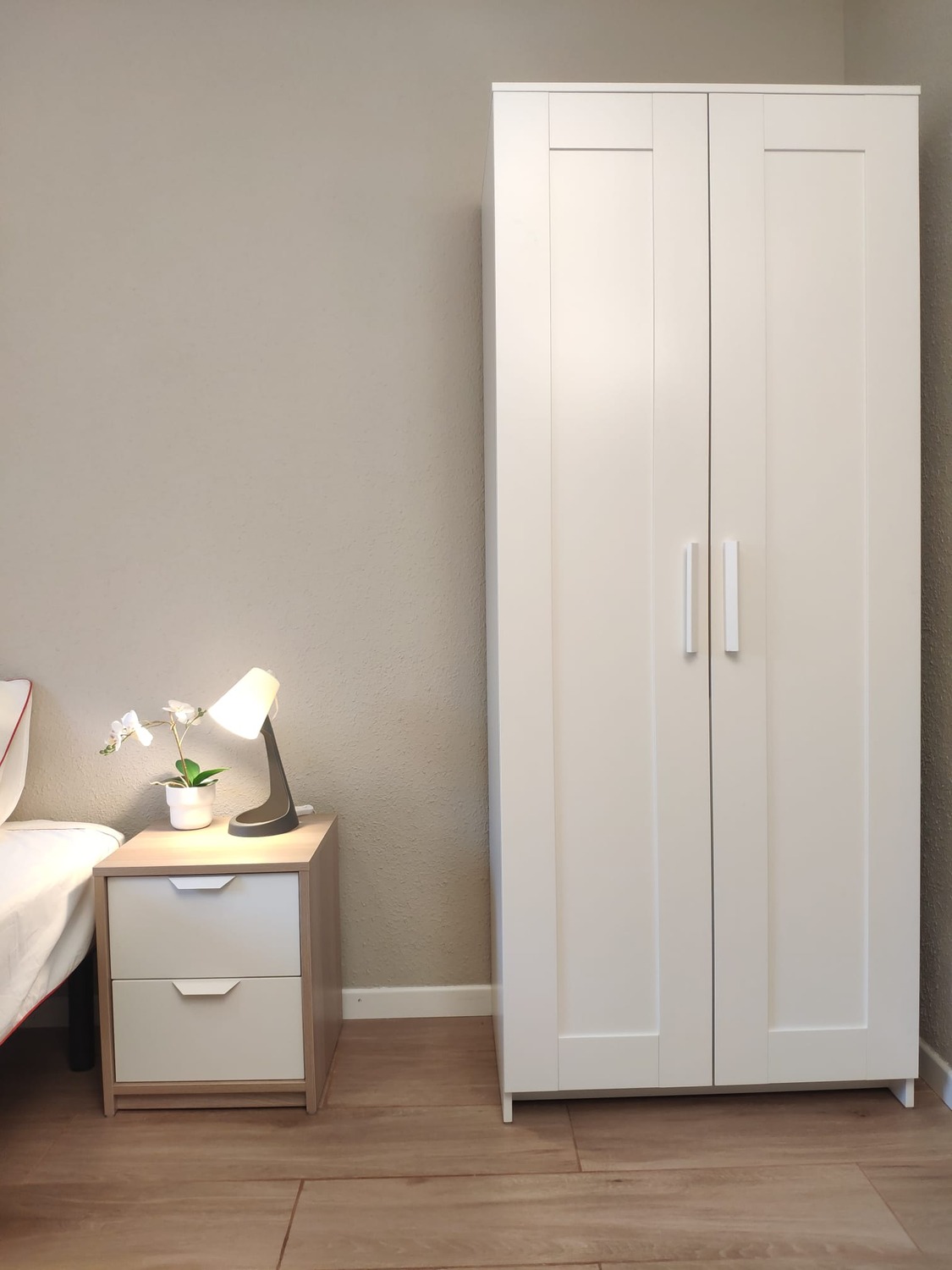 La habitación es luminosa y está perfectamente equipada, con los siguientes complementos: 1 cama de 1,05 cms con almohada, juego de sábanas y edredón, mesita de noche con lámpara, armario, escritorio con silla, perchero de pared, calefacción eléctrica.