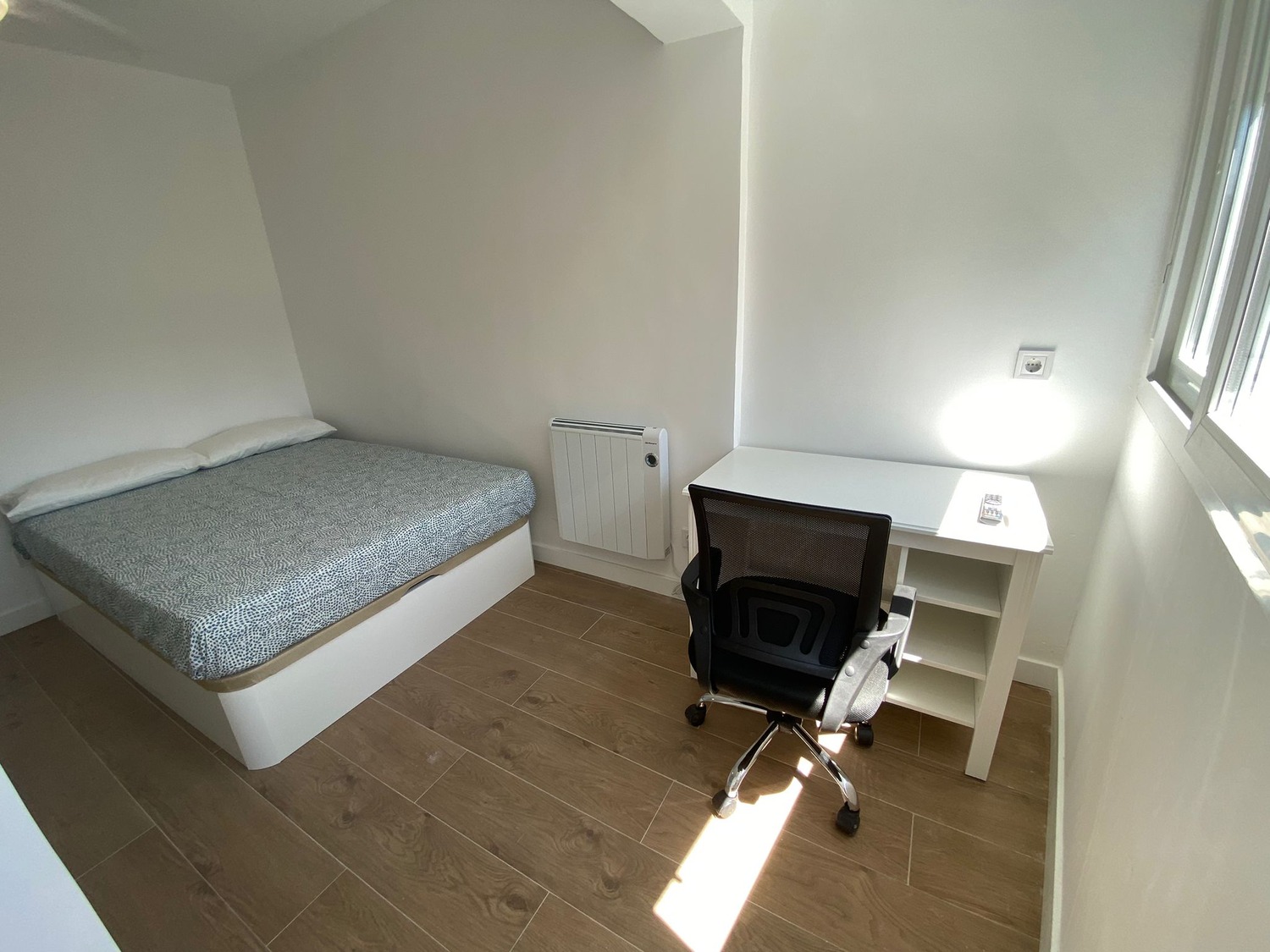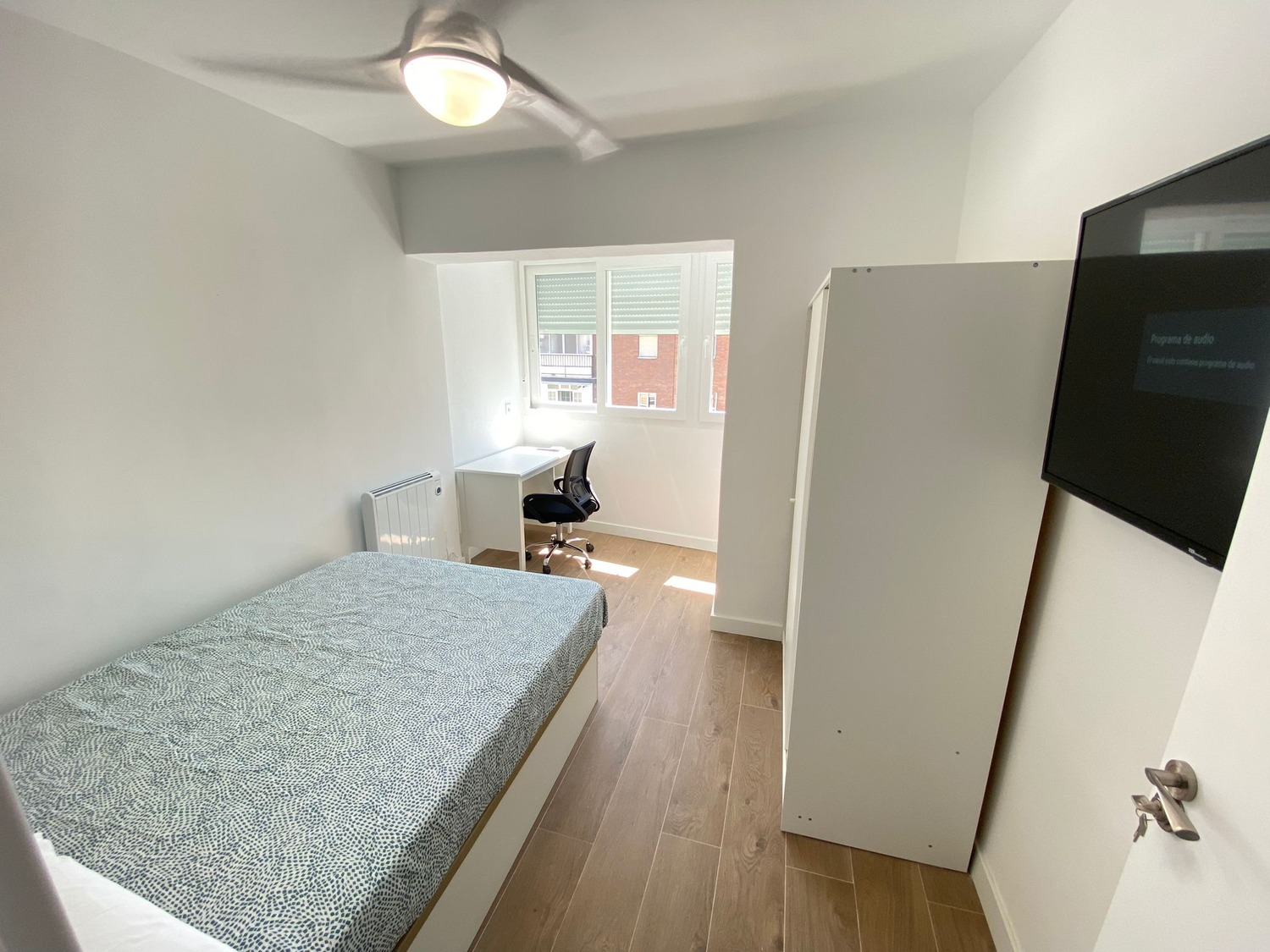 ¡Bienvenidos a la casa de estudiantes “Villaverde” ¡Estupenda habitación privada en alojamiento de estudiantes reformado en 2023, a estrenar! Alquilamos esta habitación privada, perfectamente acondicionada y con iluminación natural, con una superficie aproximada de 12m2. Cuenta con un escritorio cómodo con flexo, un televisor con Smart tv, una silla de conferencia. El mobiliario se completa con un armario de 1,55m —en cuyo interior incluye una barra para las perchas— ventilador de techo con mando a distancia y calefacción por eléctrica, la cama de ancho 0.90 m canapé abatible, además cuenta con espacio exclusivo de almacenaje.