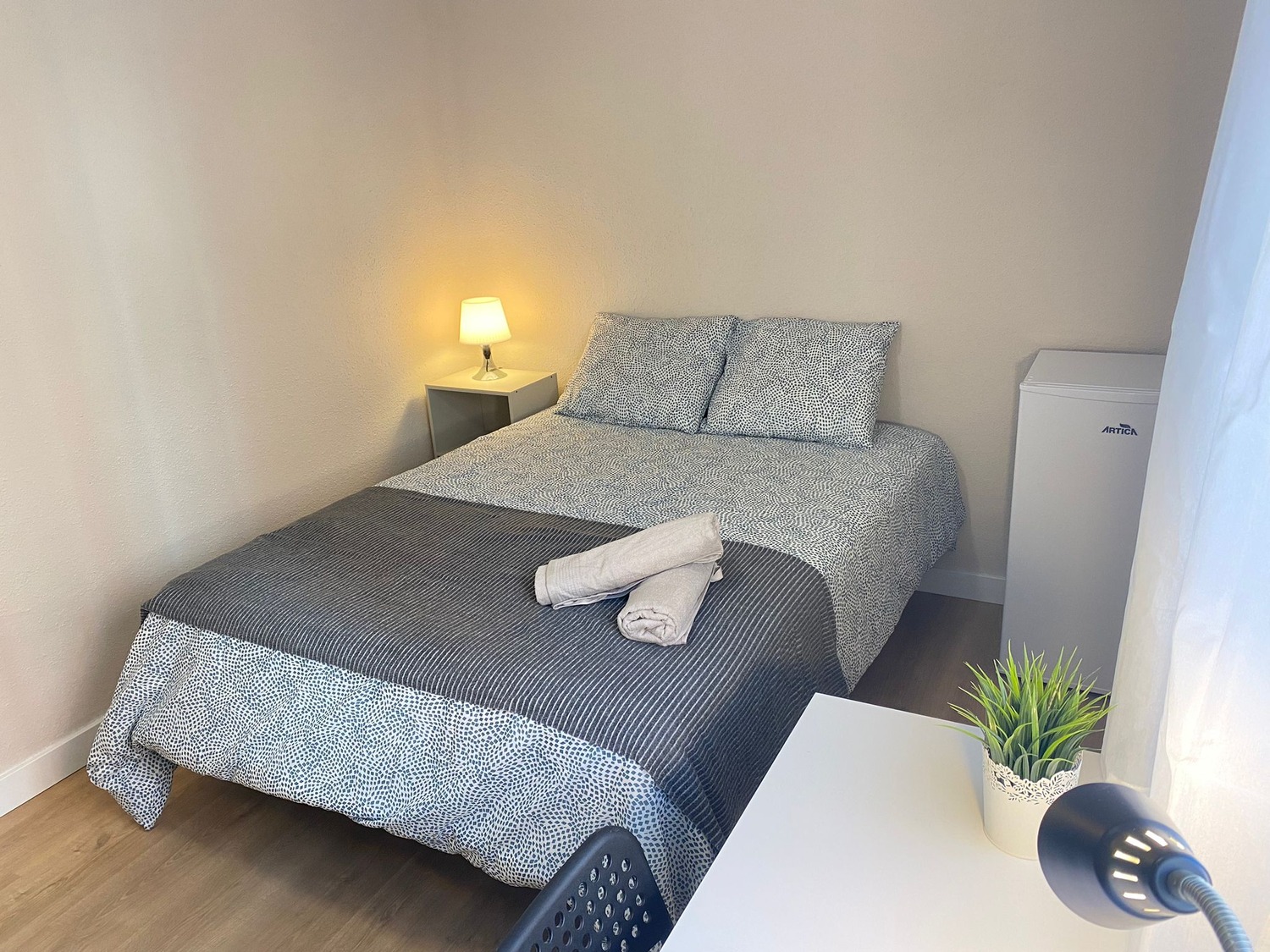 La habitación es luminosa y está perfectamente equipada, con los siguientes complementos: 1 cama de 1,35 m con almohadas, juego de sábanas y edredón, mesita de noche con lampara, armario, escritorio con silla, nevera propia y calefacción por gas natural