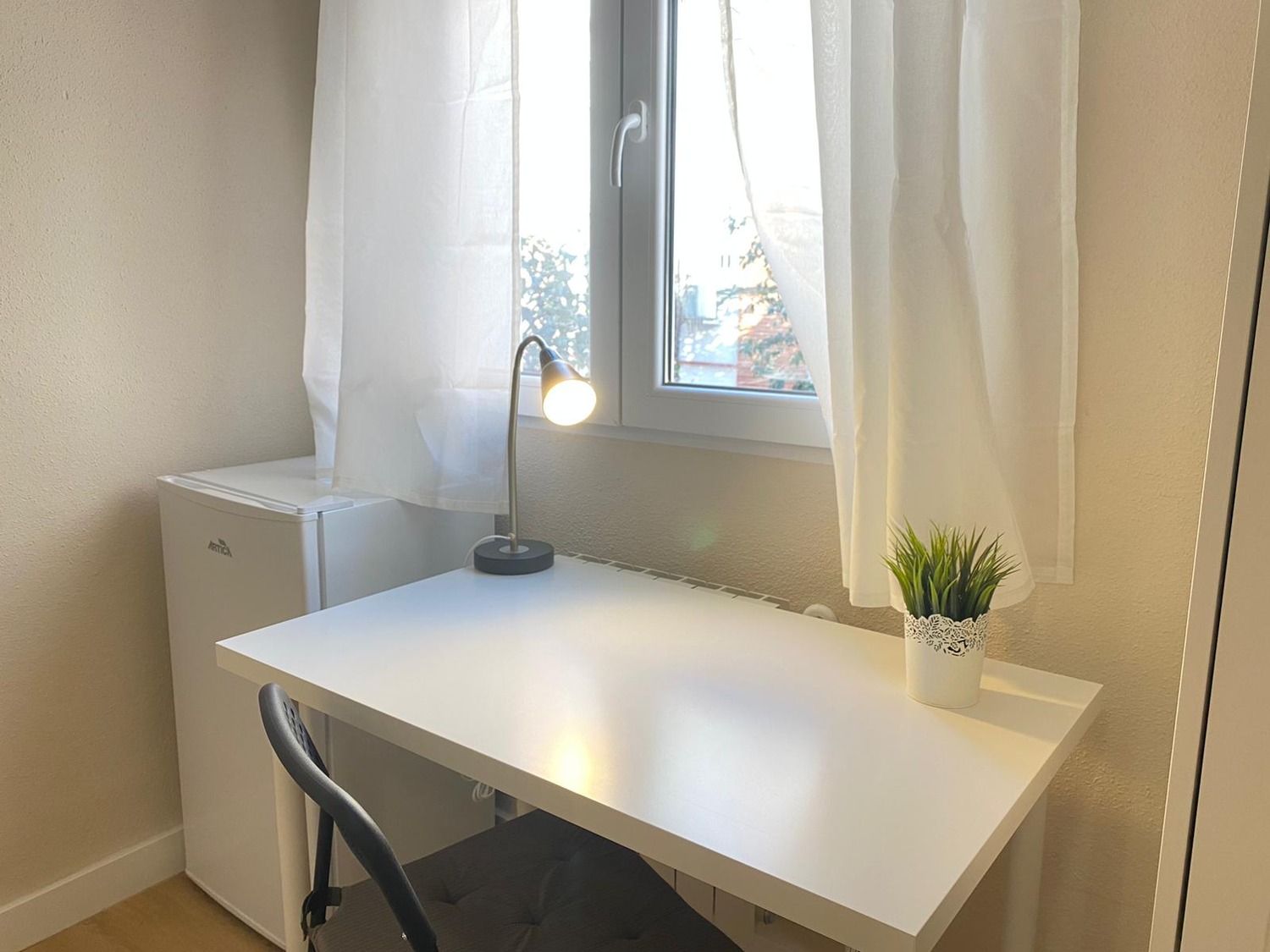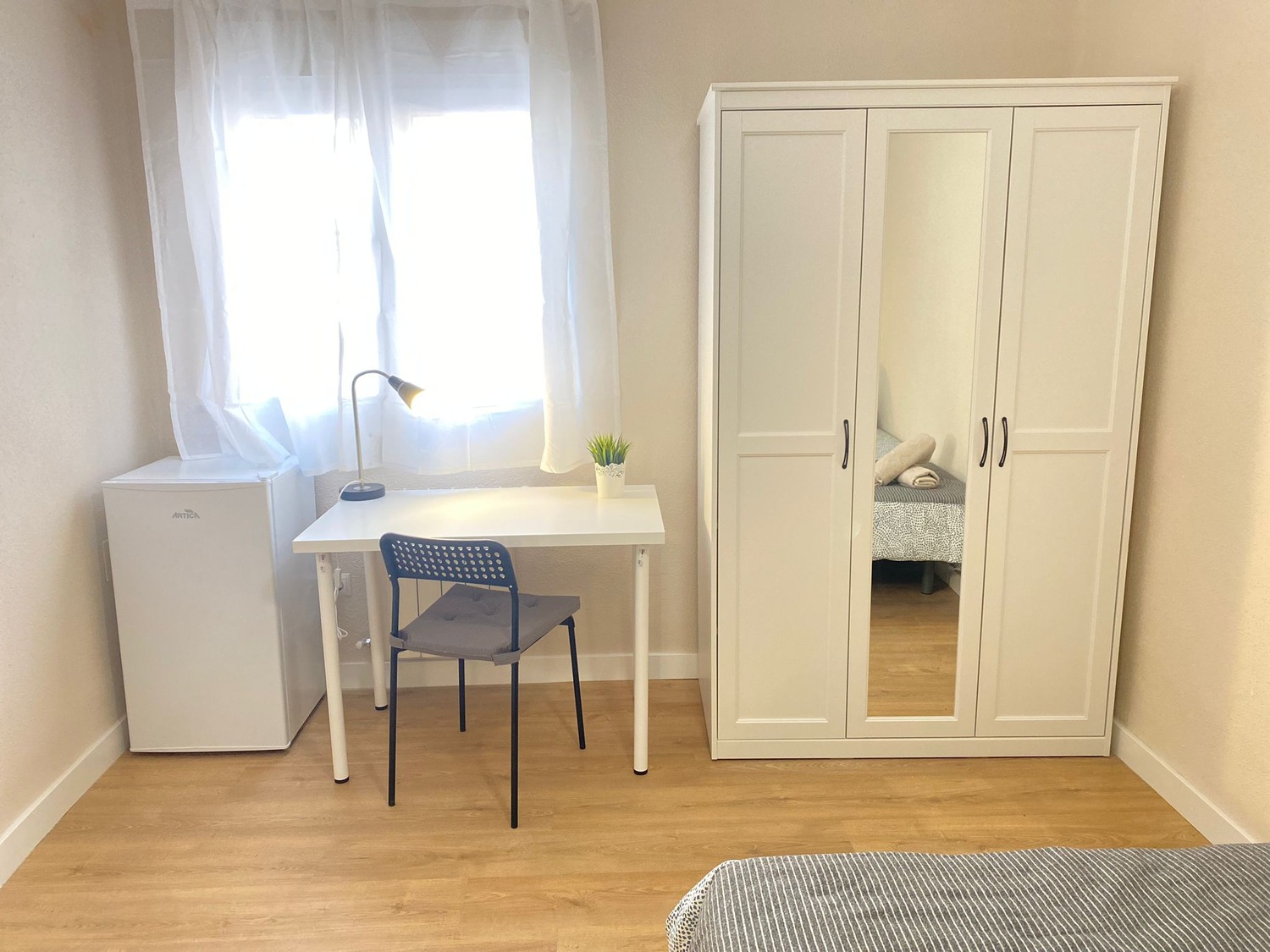 La habitación es luminosa y está perfectamente equipada, con los siguientes complementos: 1 cama de 1,35 m con almohadas, juego de sábanas y edredón, mesita de noche con lampara, armario, escritorio con silla, nevera propia y calefacción por gas natural