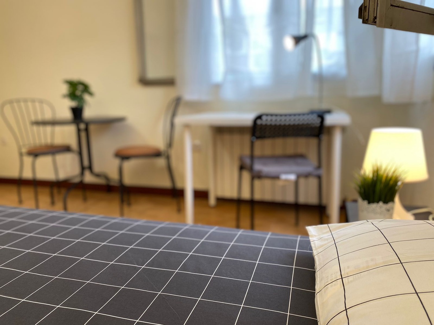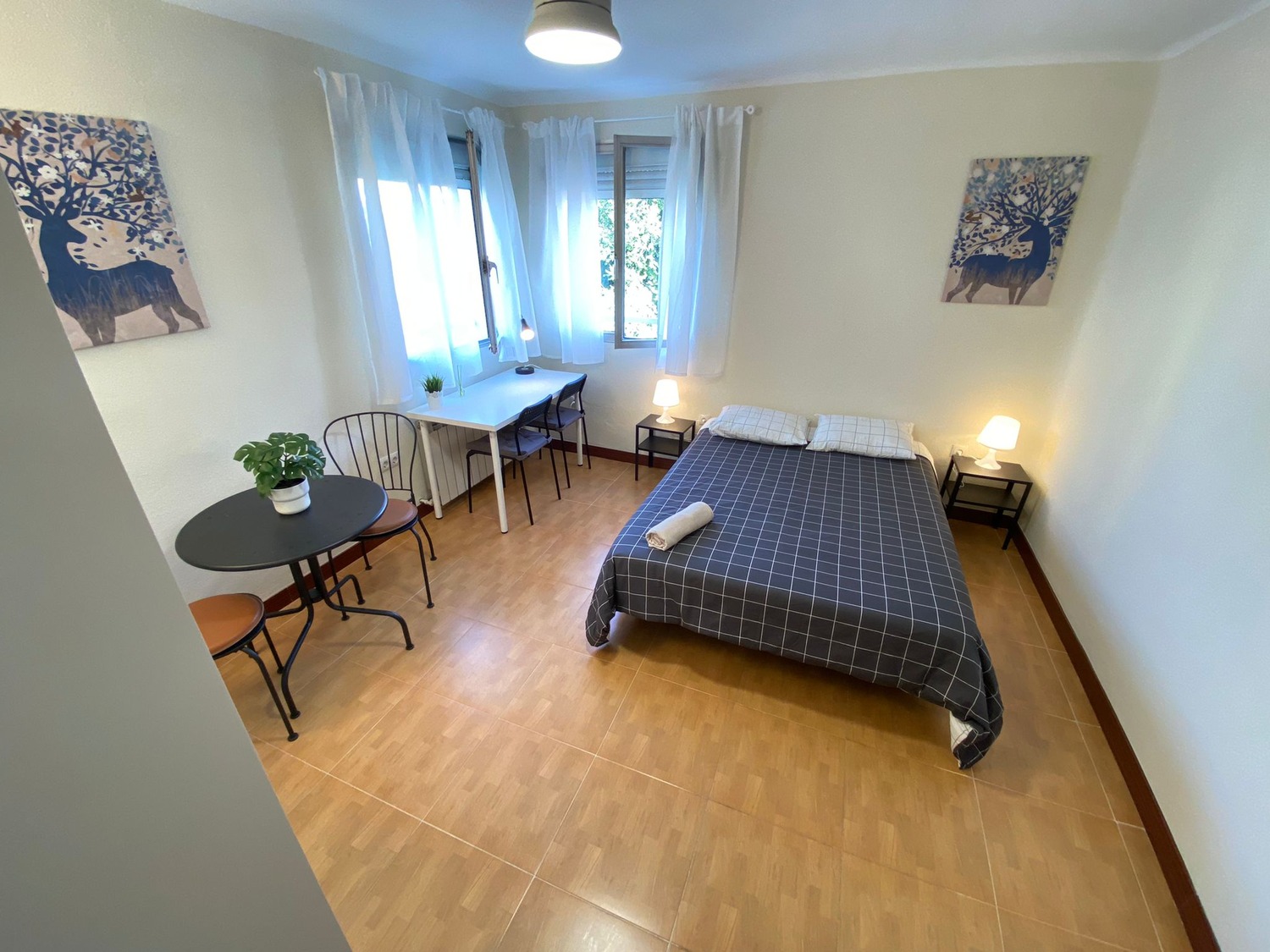 La habitación es luminosa y está perfectamente equipada, con los siguientes complementos: 1 cama de 1.35 m con dos almohadas, juego de sábanas y edredón, dos mesitas de noche con lámpara, armario, estantería, escritorio con silla, nevera individual y calefacción por gas natural.