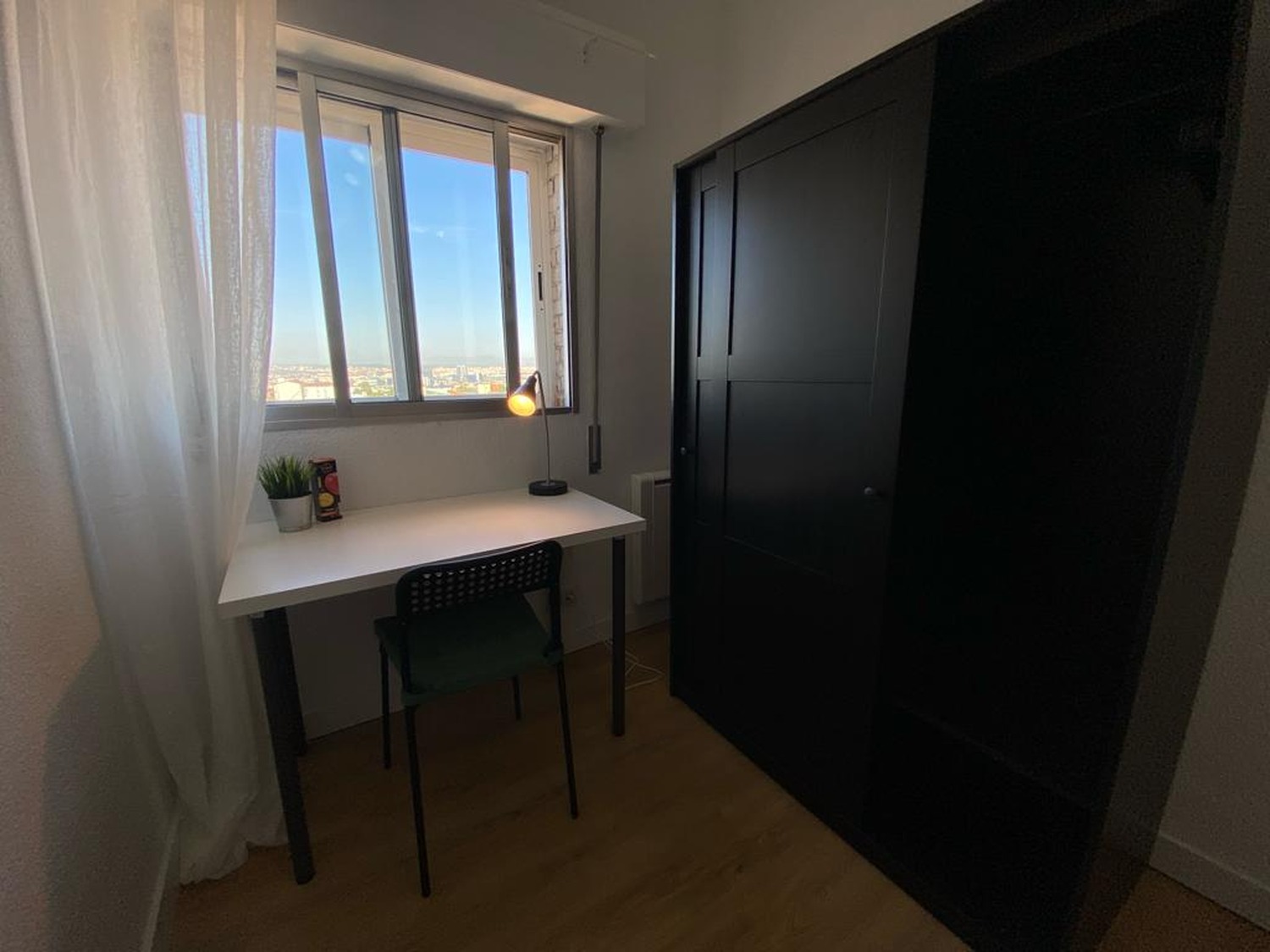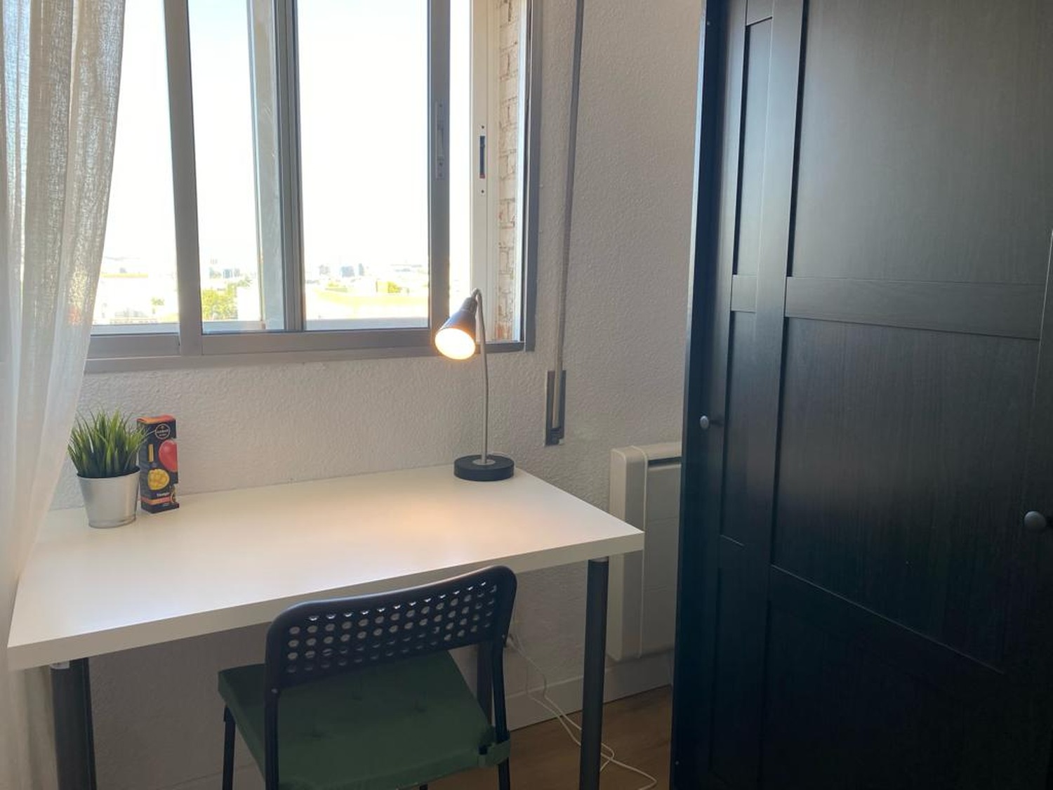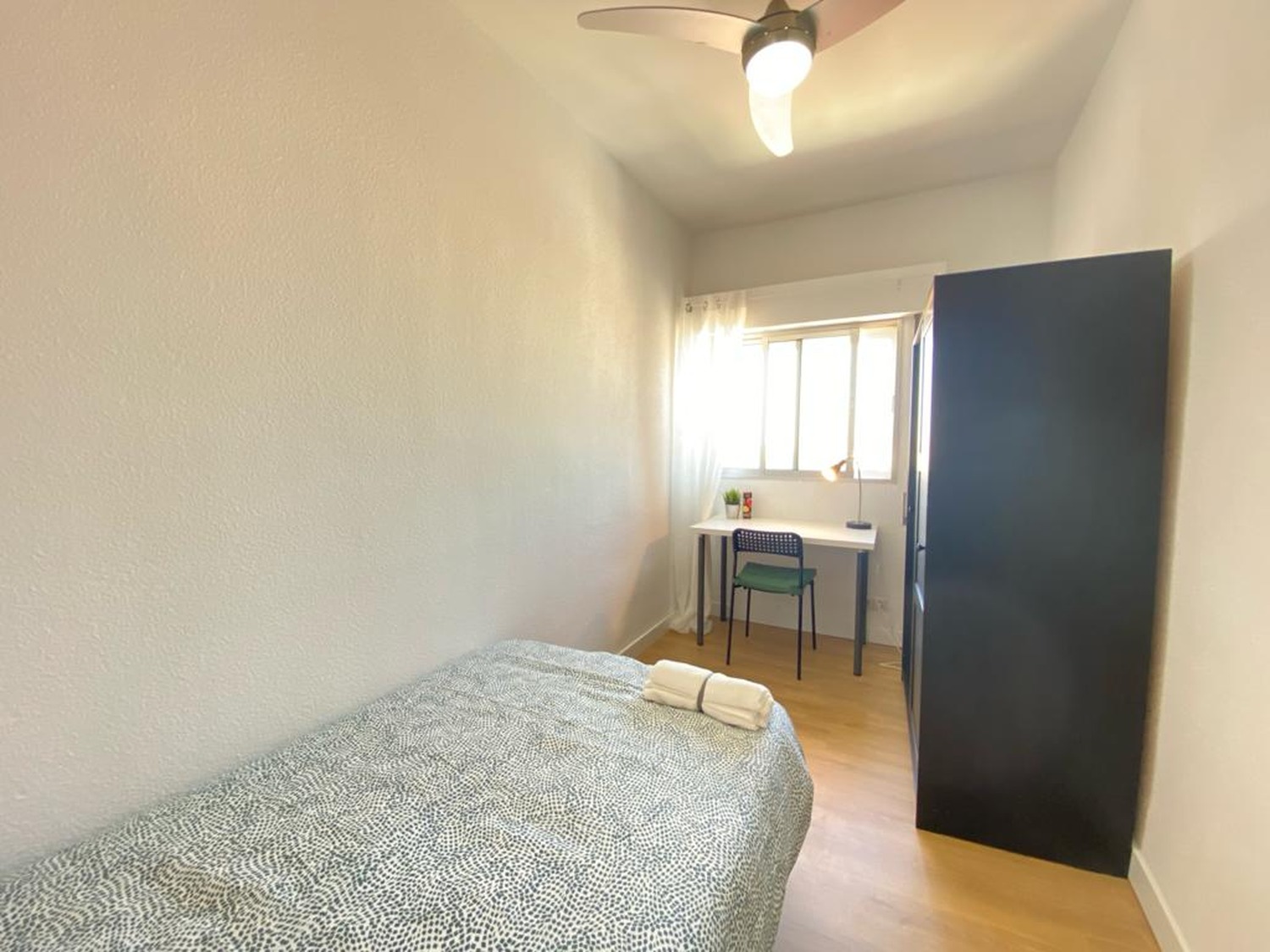 La habitación individual exterior, es luminosa y está perfectamente equipada con los siguientes complementos: 1 cama de 1,05 m con almohadas, juego de sábanas, toalla y edredón, escritorio de trabajo o estudio, mesita de noche con lámpara, varios enchufes, un espacioso armario con puertas correderas, calefacción individual eléctrica, doble ventana con buenos cerramientos y ventilador de techo.