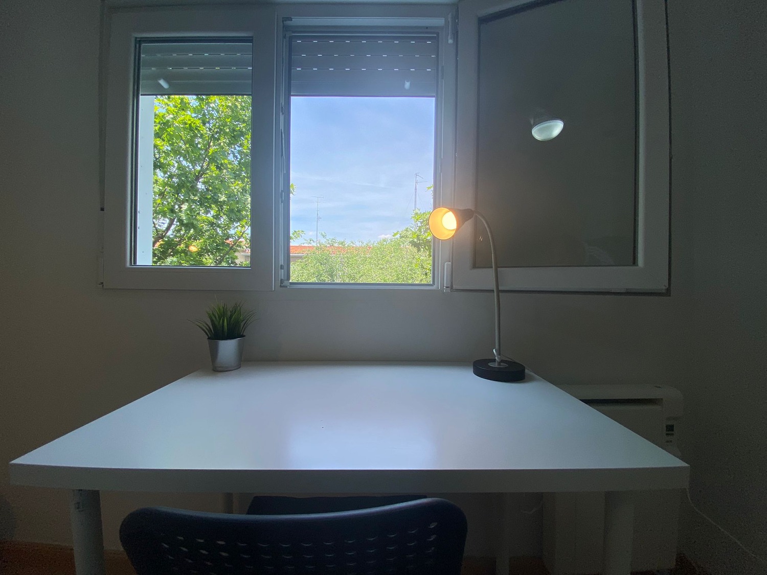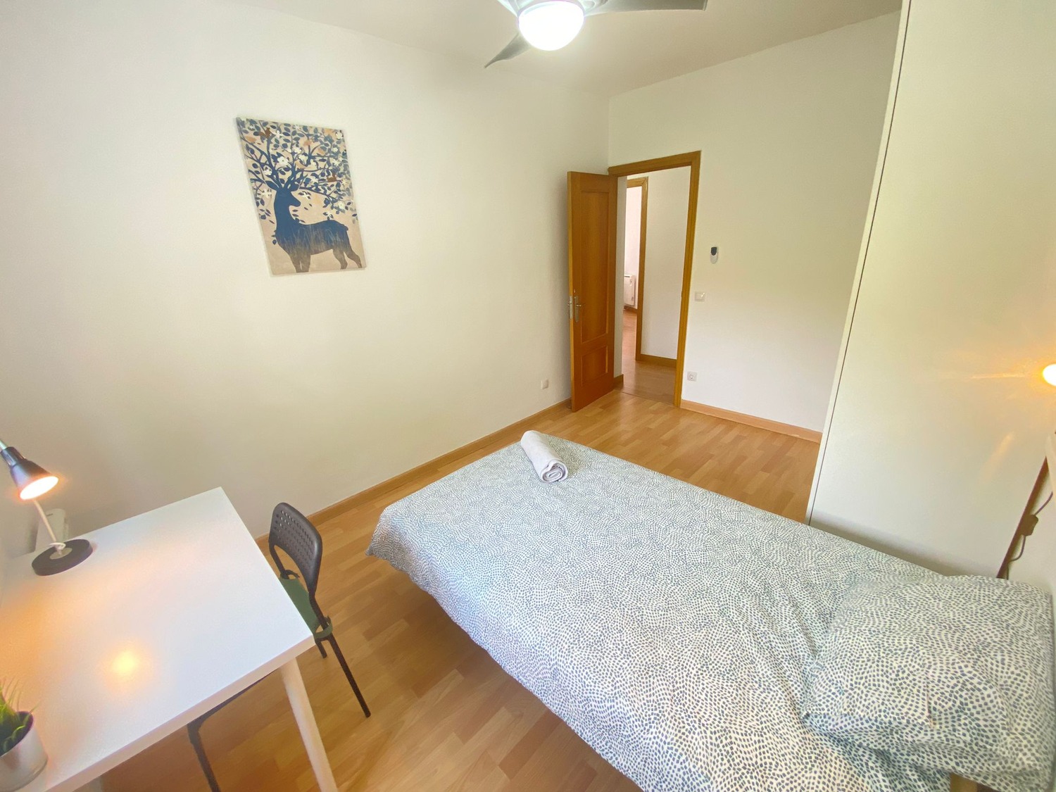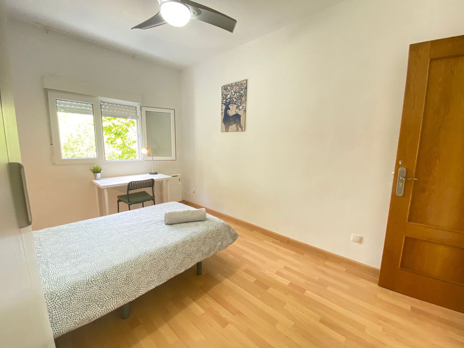La habitación es luminosa y está perfectamente equipada, con los siguientes complementos: 1 cama de 1.05 m con almohada, juego de sábanas y edredón, 1 estante de noche con lámpara, armario, escritorio con silla, calefacción eléctrica y ventilador de techo.