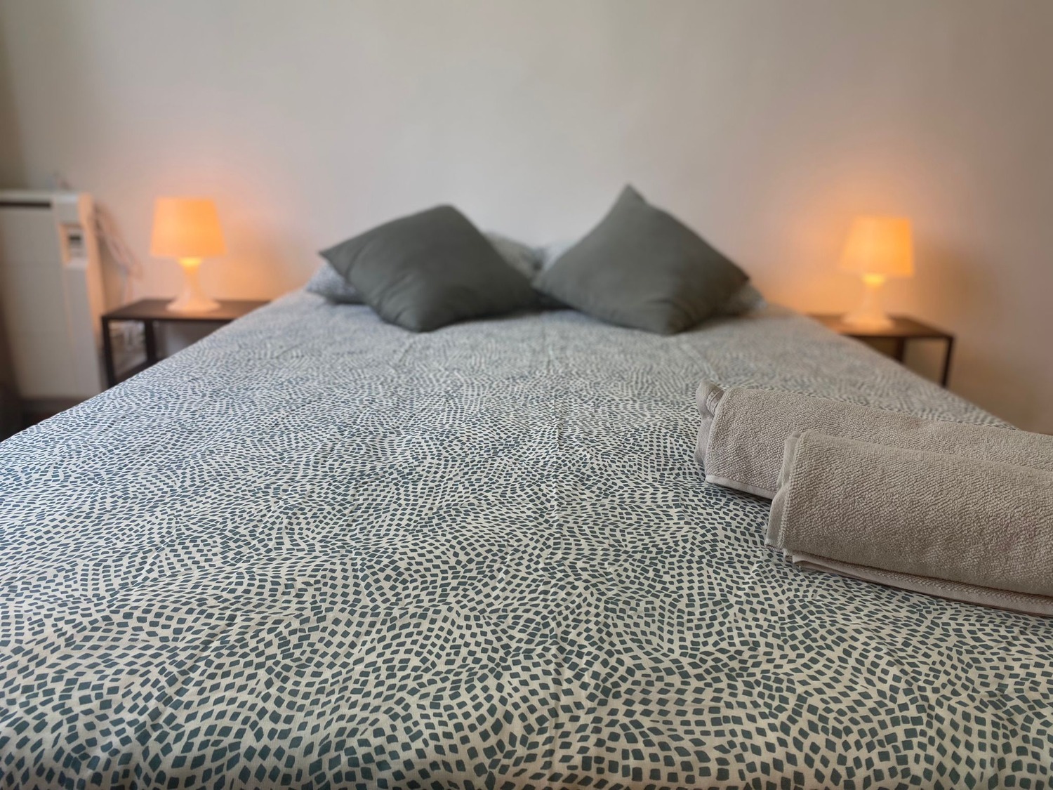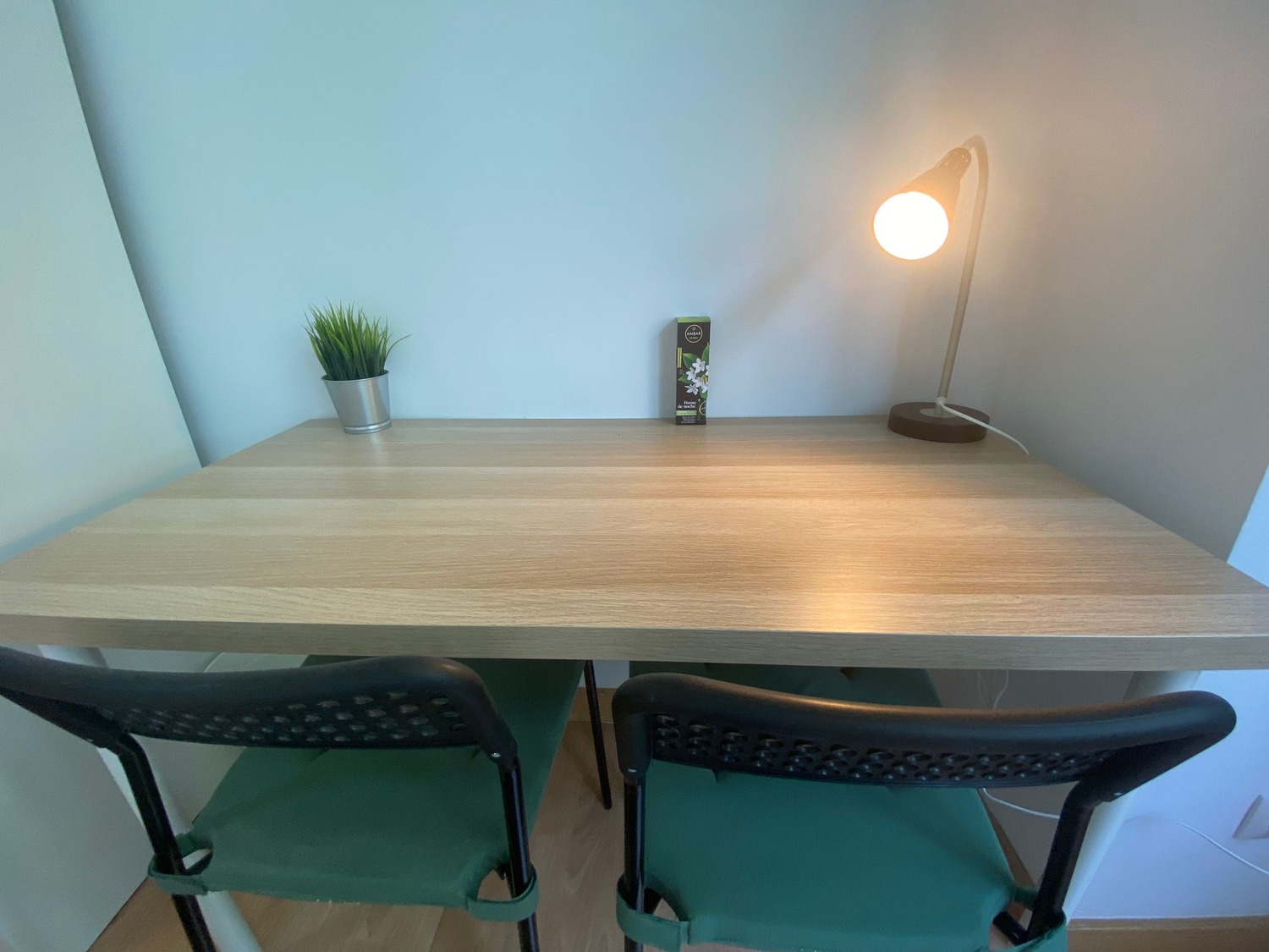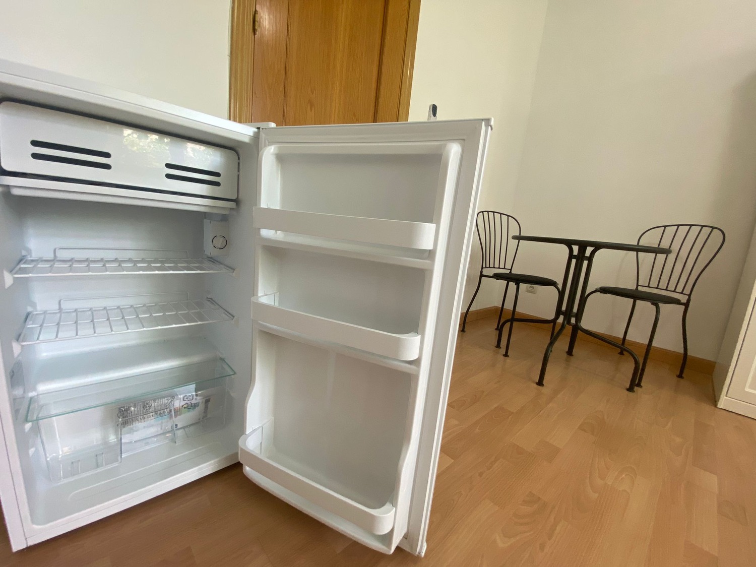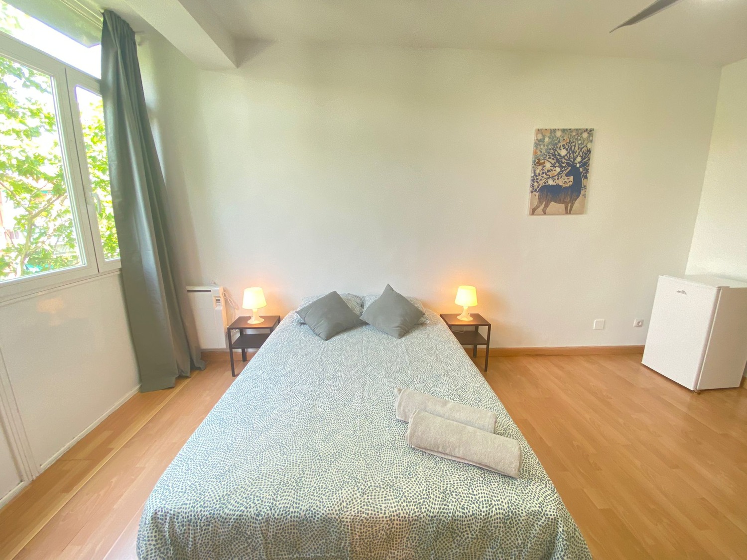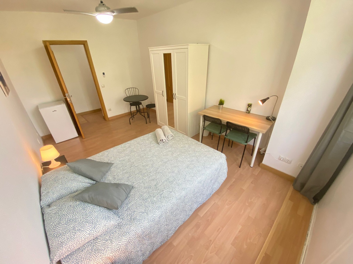 La habitación es luminosa y está perfectamente equipada, con los siguientes complementos: 1 cama de 1.40 m con almohadas, juego de sábanas y edredón, 2 mesitas de noche con lámpara, armario, escritorio con 2 sillas, calefacción eléctrica, frigorífico individual, ventilador de techo y mesa con 2 sillas.