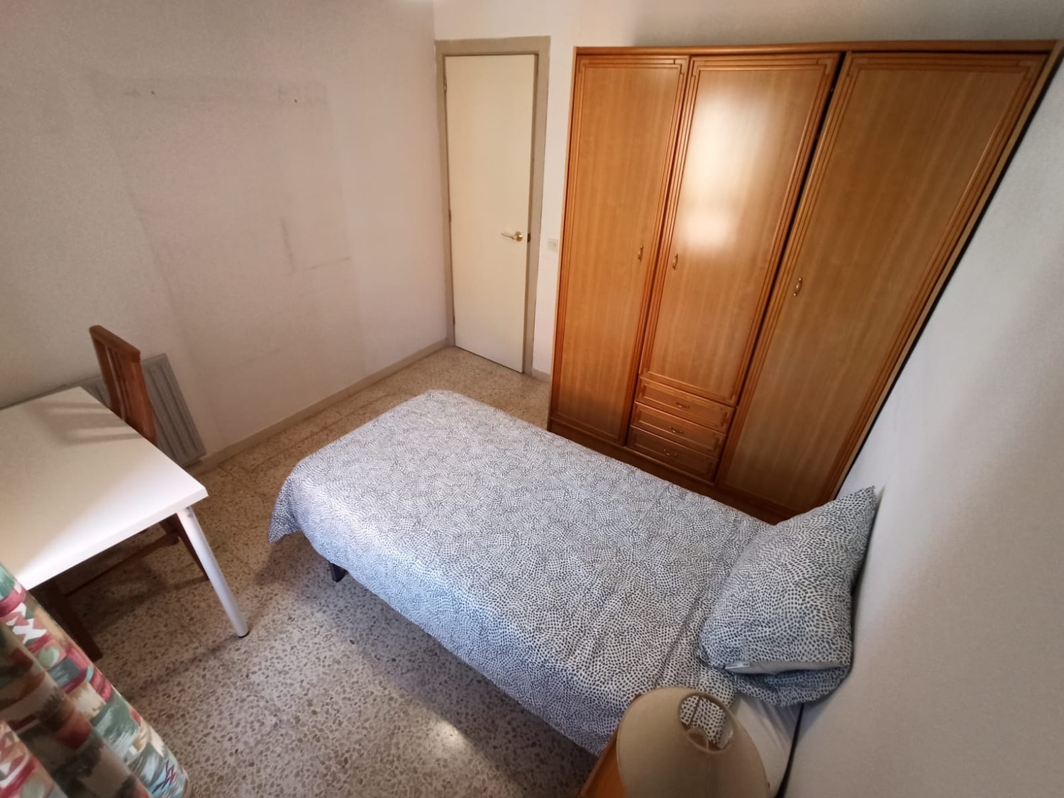 La habitación es de 14 m2 y esta perfectamente equipada con los siguientes complementos: 1 cama de 0,90m con almohadas, juego de sábanas y edredón, armario, escritorio con lámpara, silla y calefacción por gas natural.