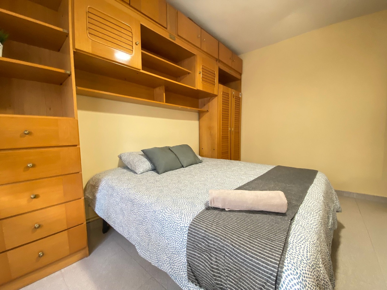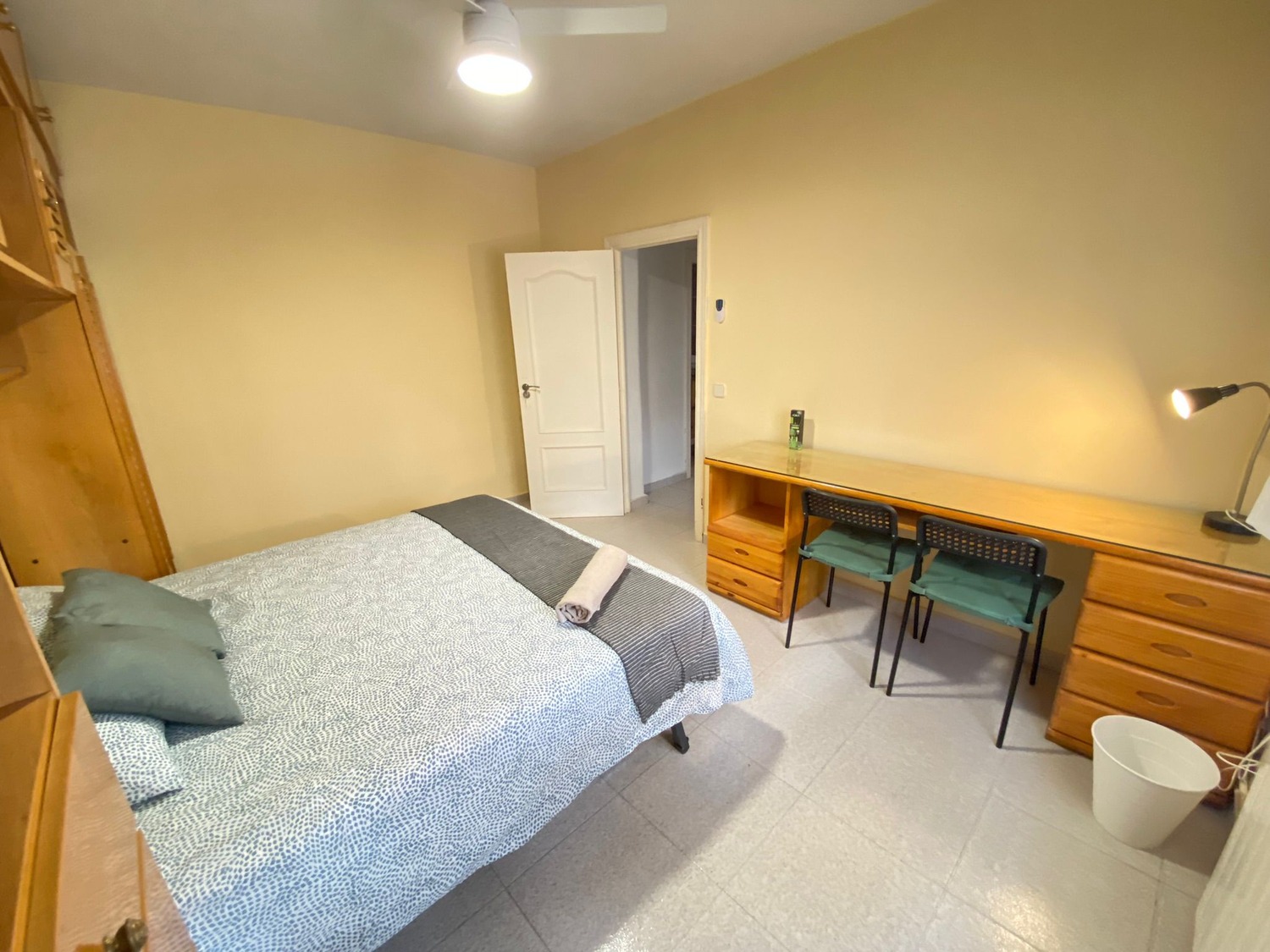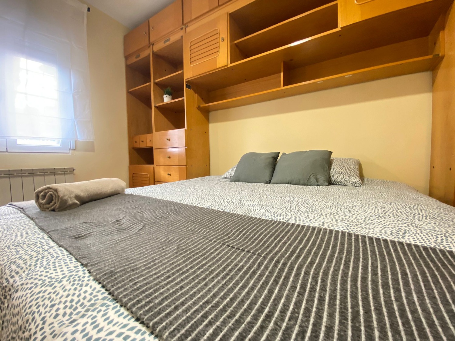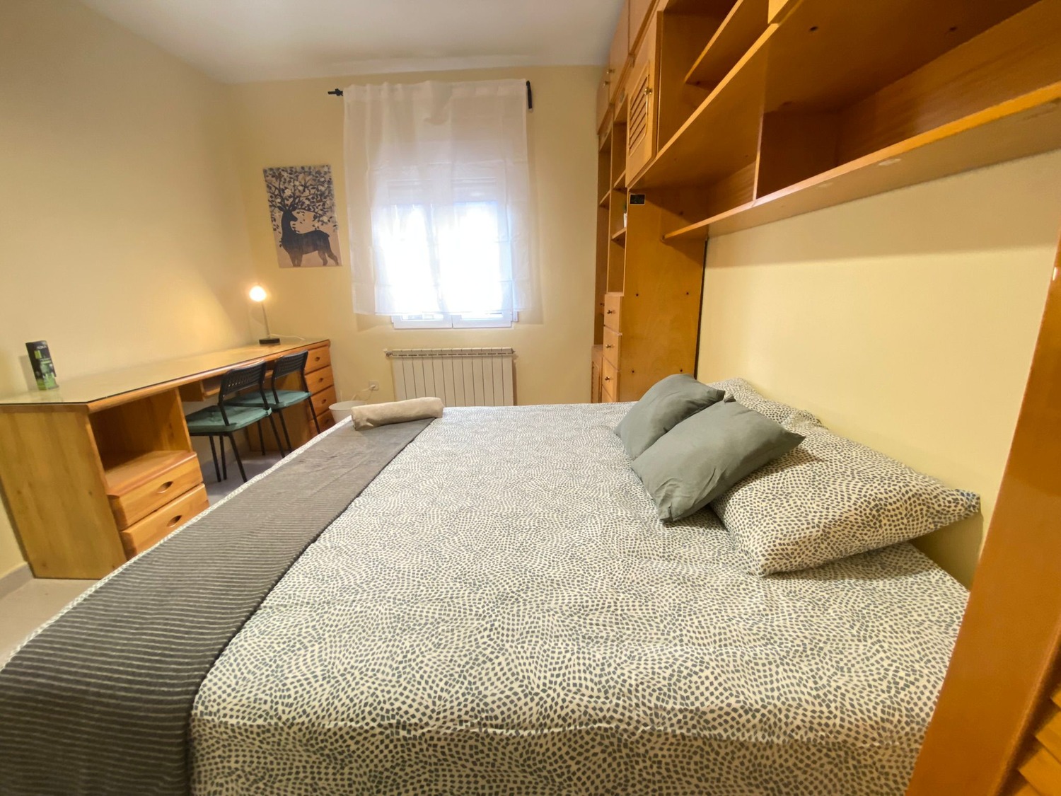 La habitación es luminosa y está perfectamente equipada, con los siguientes complementos: 1 cama de 1.60m con 2 almohadas y cojines, juego de sábanas, edredón, mesilla de noche con lámpara, un espacioso armario, calefacción por gas natural individual y cerramientos de doble cristal con las mejores calidades.