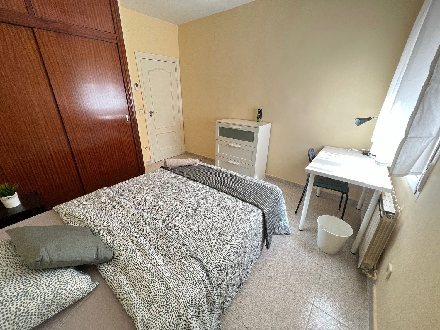 La habitación es de 14 m2 y esta perfectamente equipada con los siguientes complementos: 1 cama de 1.35 m con almohadas, juego de sábanas y edredón, armario, escritorio con lámpara, silla y calefacción eléctrica.