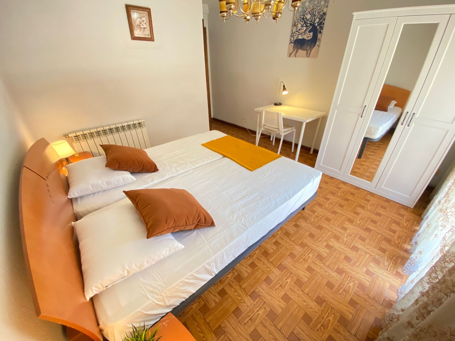 Habitación con balcón muy luminosa y perfectamente equipada con los siguientes complementos: 1 cama de 1.60 m con almohada, juego de sábanas y edredón, mesita de noche con lámpara, armario con espejo, escritorio con silla y nevera individual. Calefacción por gas natural.