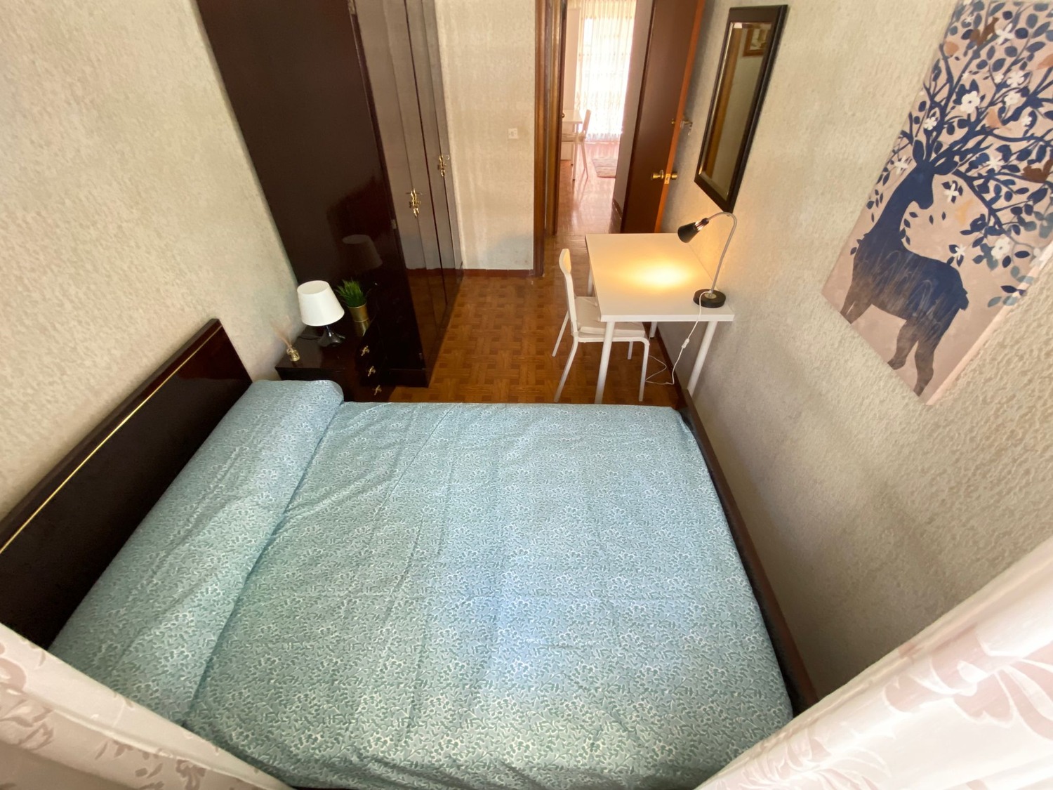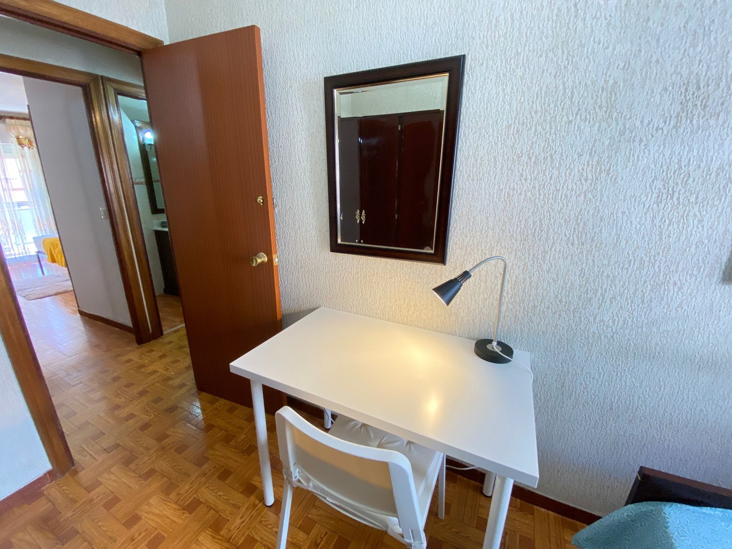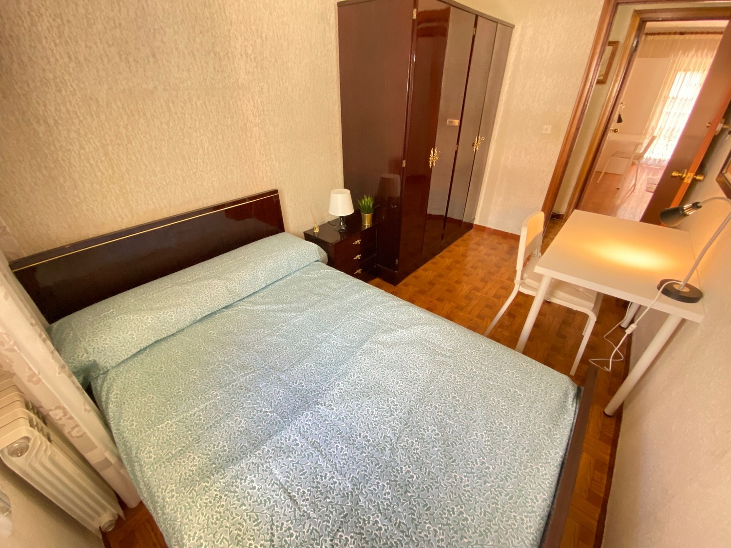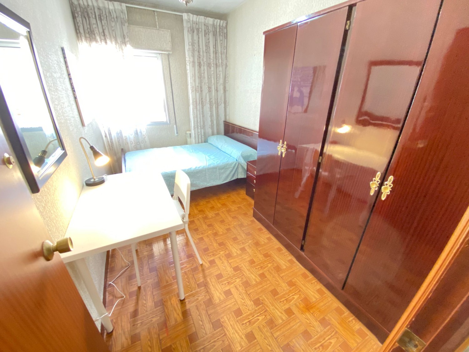 La habitación es luminosa y está perfectamente equipada con los siguientes complementos: 1 cama de 1.60 m con almohada, juego de sábanas y edredón, mesita de noche con lámpara, armario con espejo, escritorio con silla. Calefacción por gas natural.