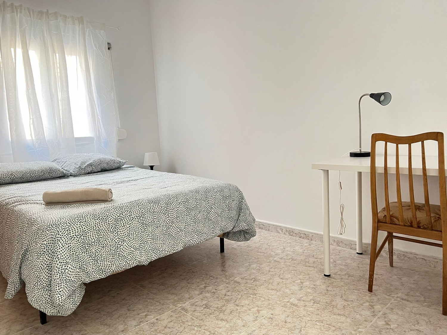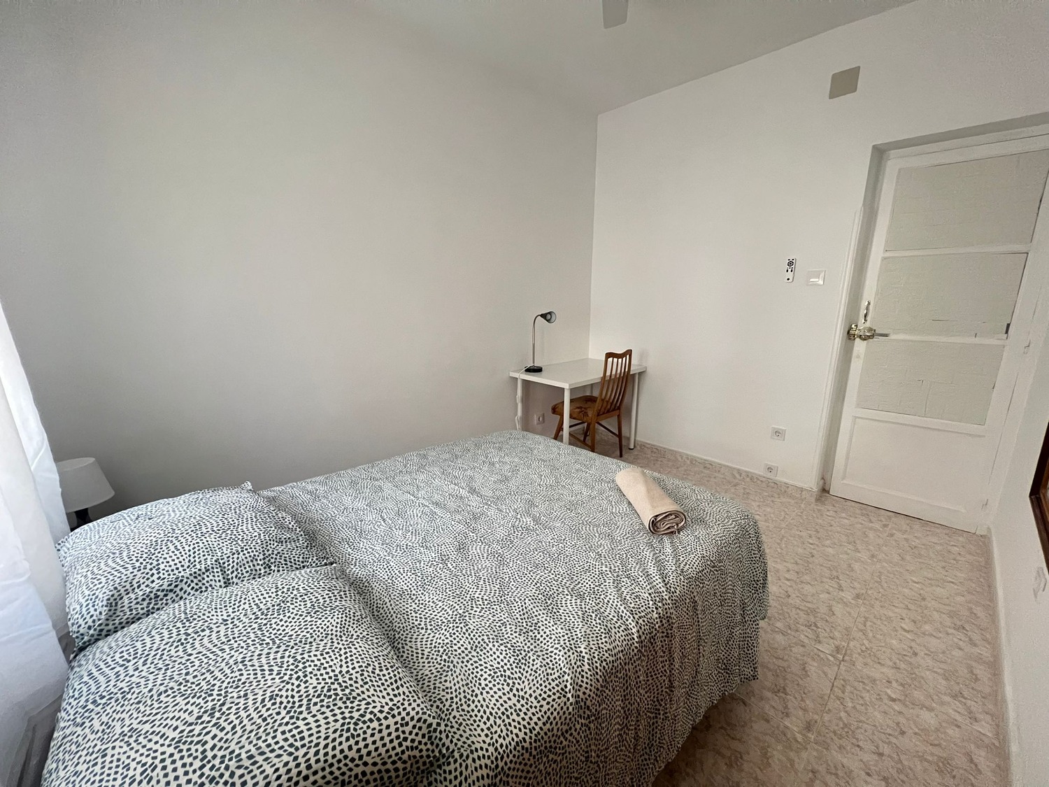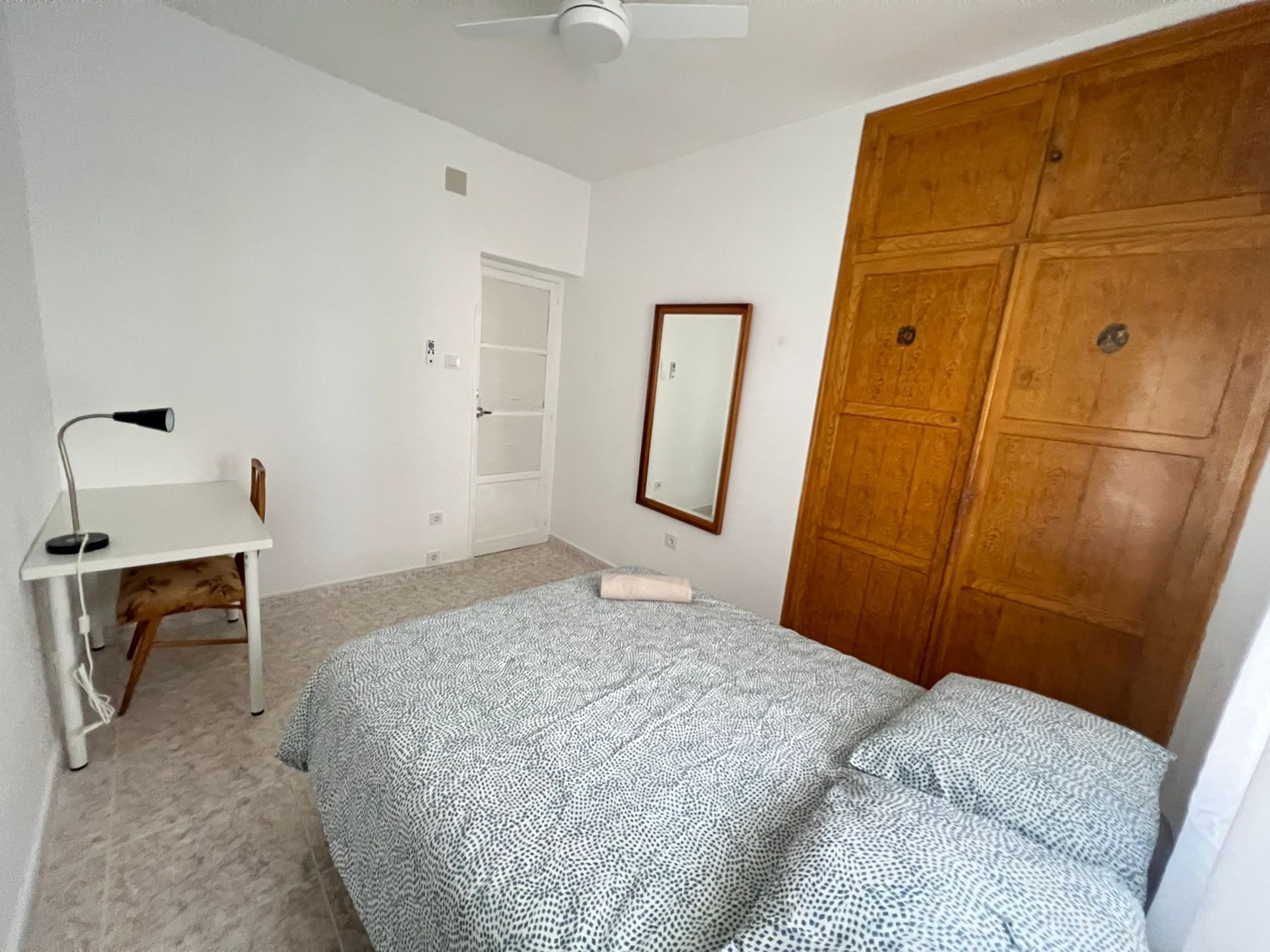 La habitación es de 14 m2 y esta perfectamente equipada con los siguientes complementos: 1 cama de 1.35 m con almohadas, juego de sábanas y edredón, armario, escritorio con lámpara, silla y calefacción eléctrica.
