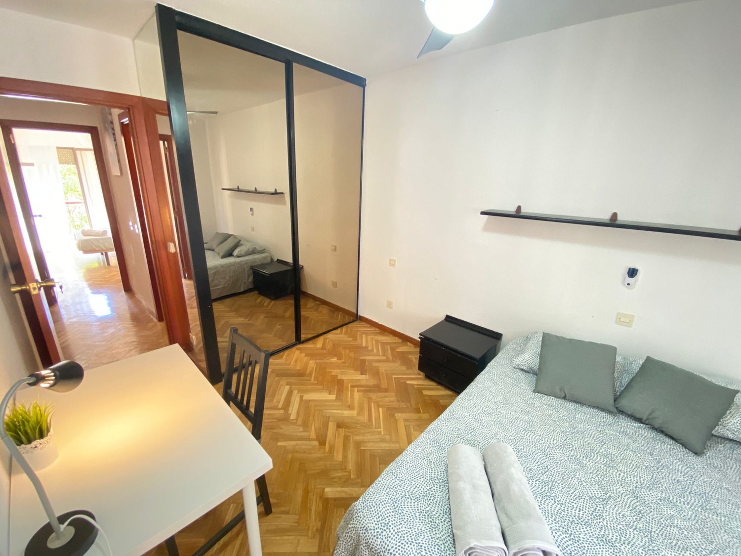 CAPITAL ROOMS alquila esta fantástica habitación individual o doble en piso compartido, URBANIZACION CERRADA, PISCINA, PLZ GARAJE OPCIONAL, edificio Plaza de Castilla, ubicado en la Calle de Simancas 21, en Plaza Castilla, una de las zonas más seguras de Madrid y concurridas, muy bien comunicada (a 4 minutos de Metro Moncloa — línea 6, paseo de la Castellana, varias líneas de autobuses, un barrio dotado de todos los servicios, frente a los juzgados de Madrid, a la Escuela Profesional IEM, cerca de supermercados, una comisaría de Policía, bares, restaurantes y con todo tipo de servicios de la zona norte de Madrid. La habitación es EXTERIOR, luminosa y perfectamente equipada, con los siguientes complementos: 1 cama de 1,35 m con almohadas, juego de sábanas y edredón, mesita de noche, escritorio con silla y lampara, un espacioso armario doble con espejo, calefacción por gas natural individual. Todas las habitaciones incluyen cerradura con llave privada Y conexión wifi por fibra de alta velocidad. La propiedad cuenta con dos baños amplios y completos. En cuanto a las zonas comunes, la vivienda cuenta con una amplia cocina, amueblada y equipada con todos los electrodomésticos (frigorífico, cocina, lavadora, caldera/calentador eléctrico, microondas) y el menaje necesario (cacerolas, sartenes, cubertería y cristalería).