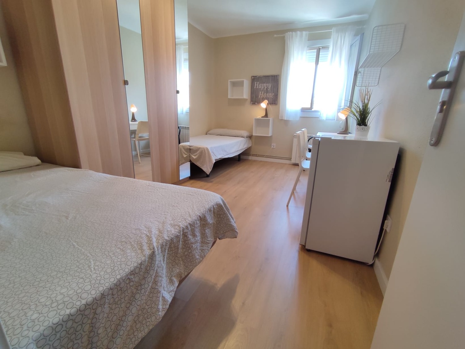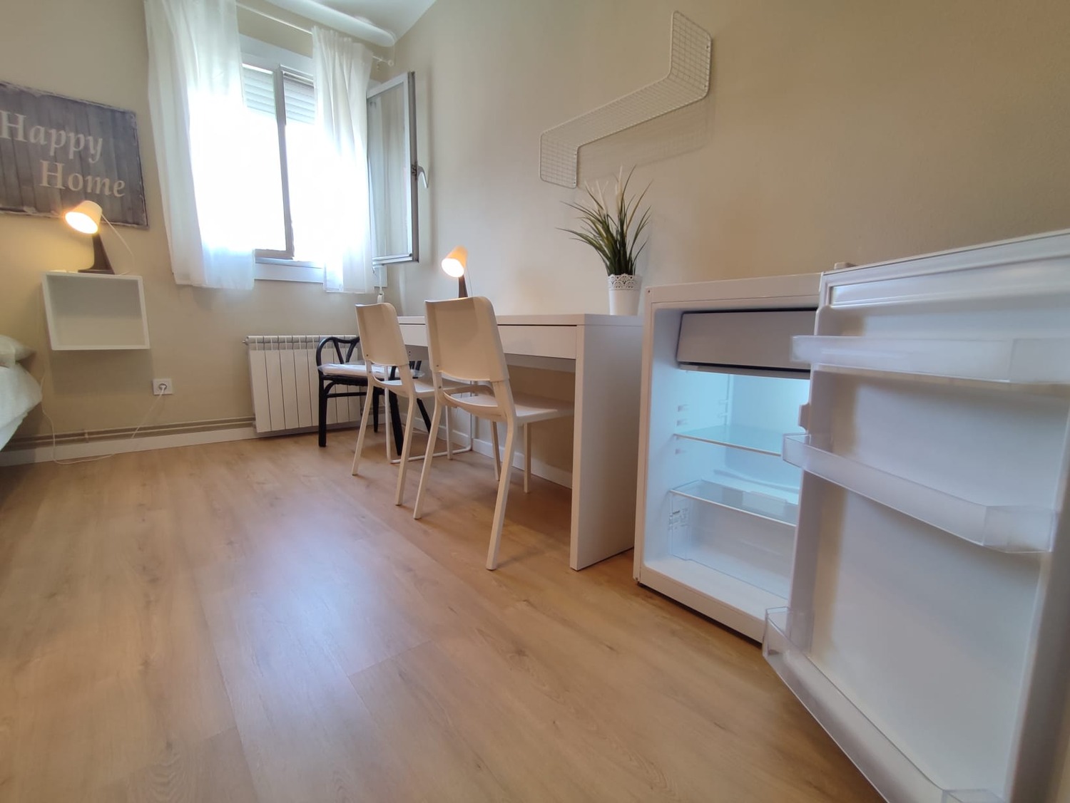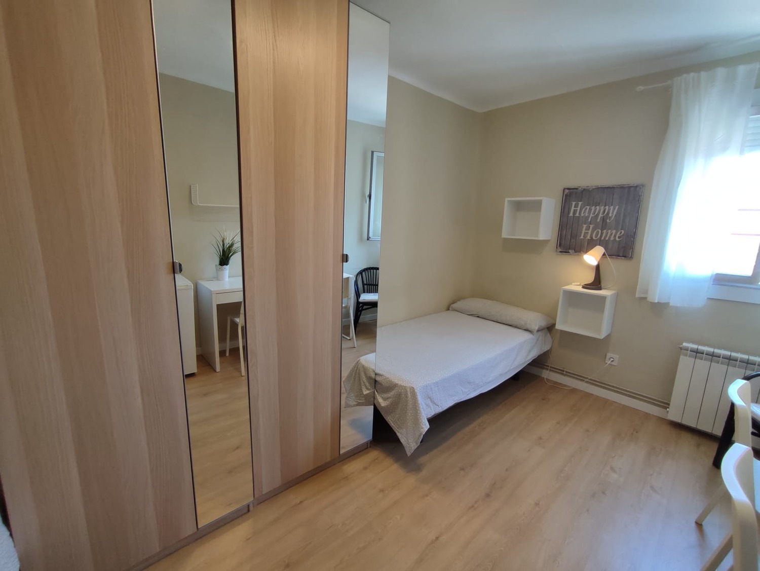 Excelente habitación en piso compartido para estudiantes, cuenta con 2 camas individuales de 1,05cm, una mesa de noche con lampara, un escritorio cristalizado con silla para tus horas de estudioo trabajo desde casa, un armario amplio, una de las grandes ventajas es la ubicacion, se encuentra a 2 minutos de avenida La Albufera, al lado de la estación del metro de Nueva Numancia linea 1 y lineas de autobus, supermecados, bancos y comercio; a 8 minutos de la estacion de Puerta de Atocha y a 11 minutos de la Puerta del Sol, piso muy acogedor, excelente convivencia.