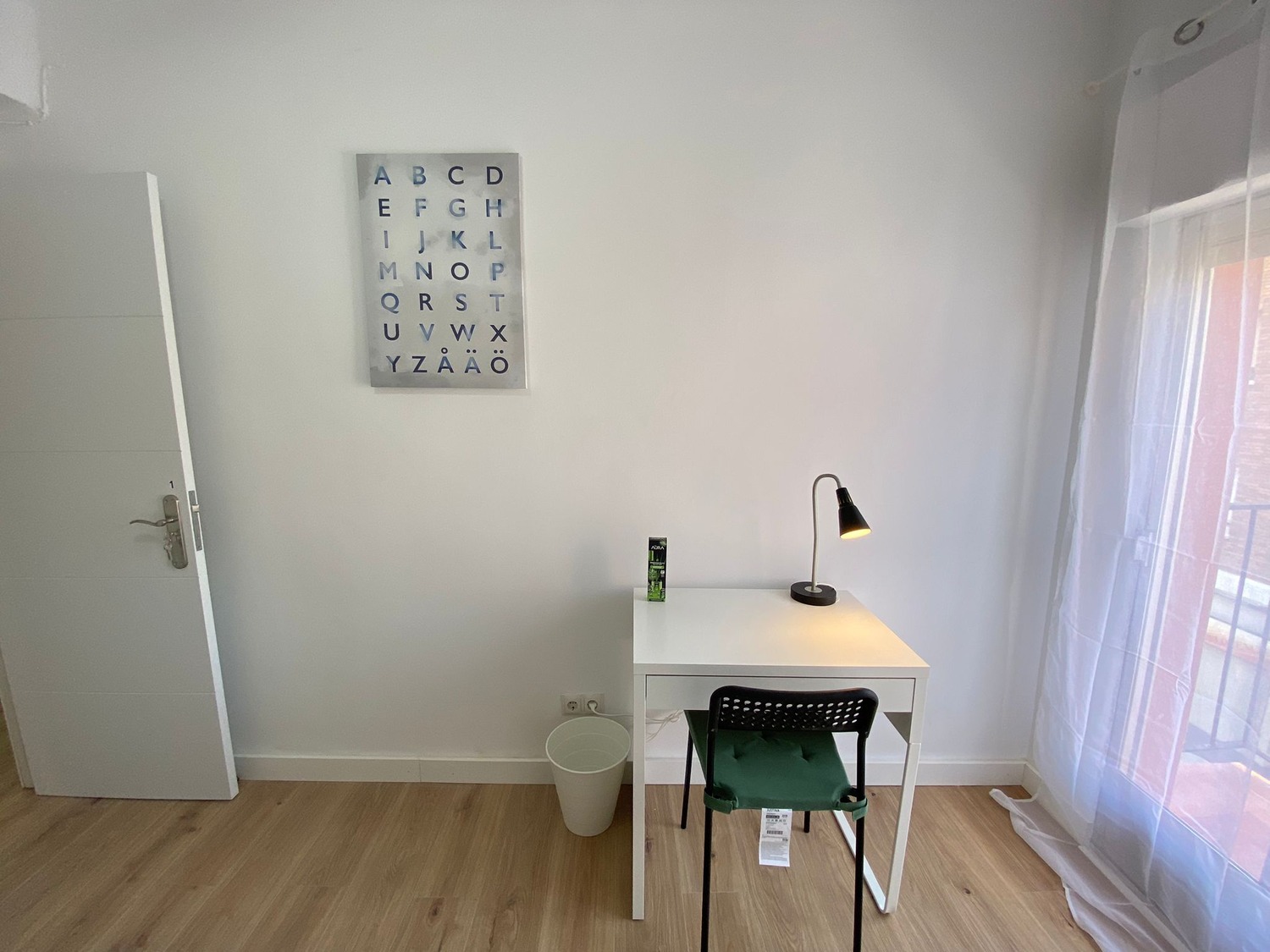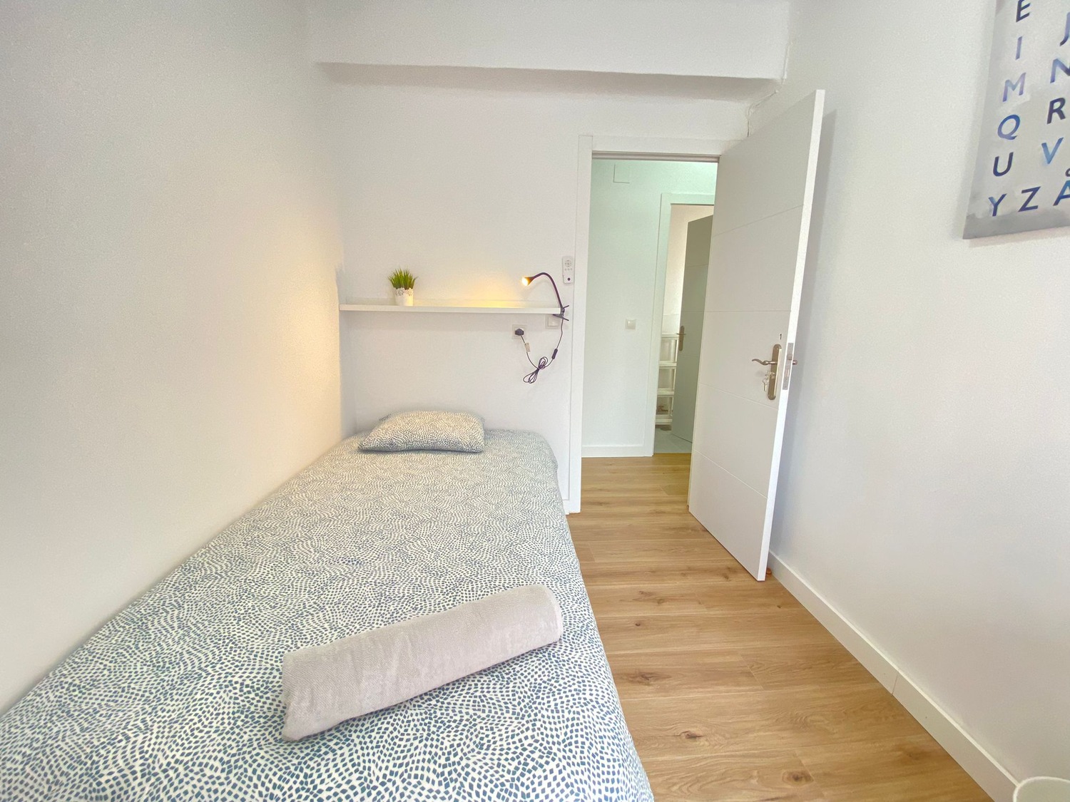 La habitación es luminosa y está perfectamente equipada, con los siguientes complementos: 1 cama de 90 cm con 1 almohada, juego de sábanas y edredón, estante con lámpara, armario, escritorio con silla, ventilador de techo y balcon.