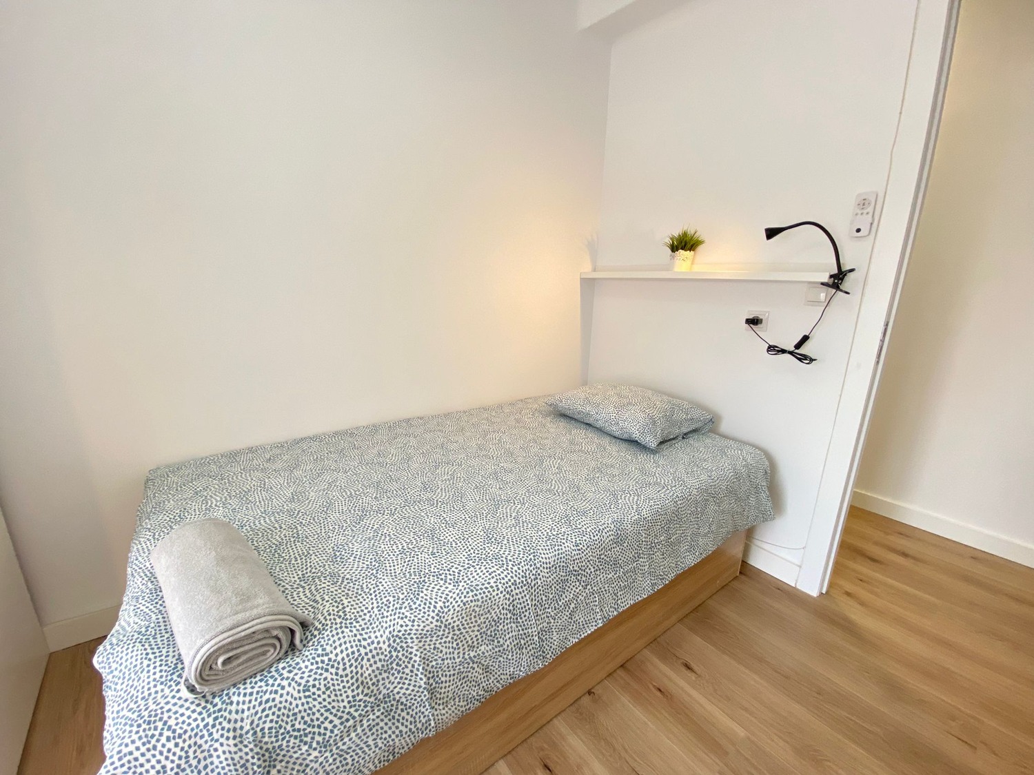 La habitación es luminosa y está perfectamente equipada, con los siguientes complementos: 1 cama de 90 cm con 1 almohada, juego de sábanas y edredón, estante con lámpara, armario, escritorio con silla, ventilador de techo y balcon.