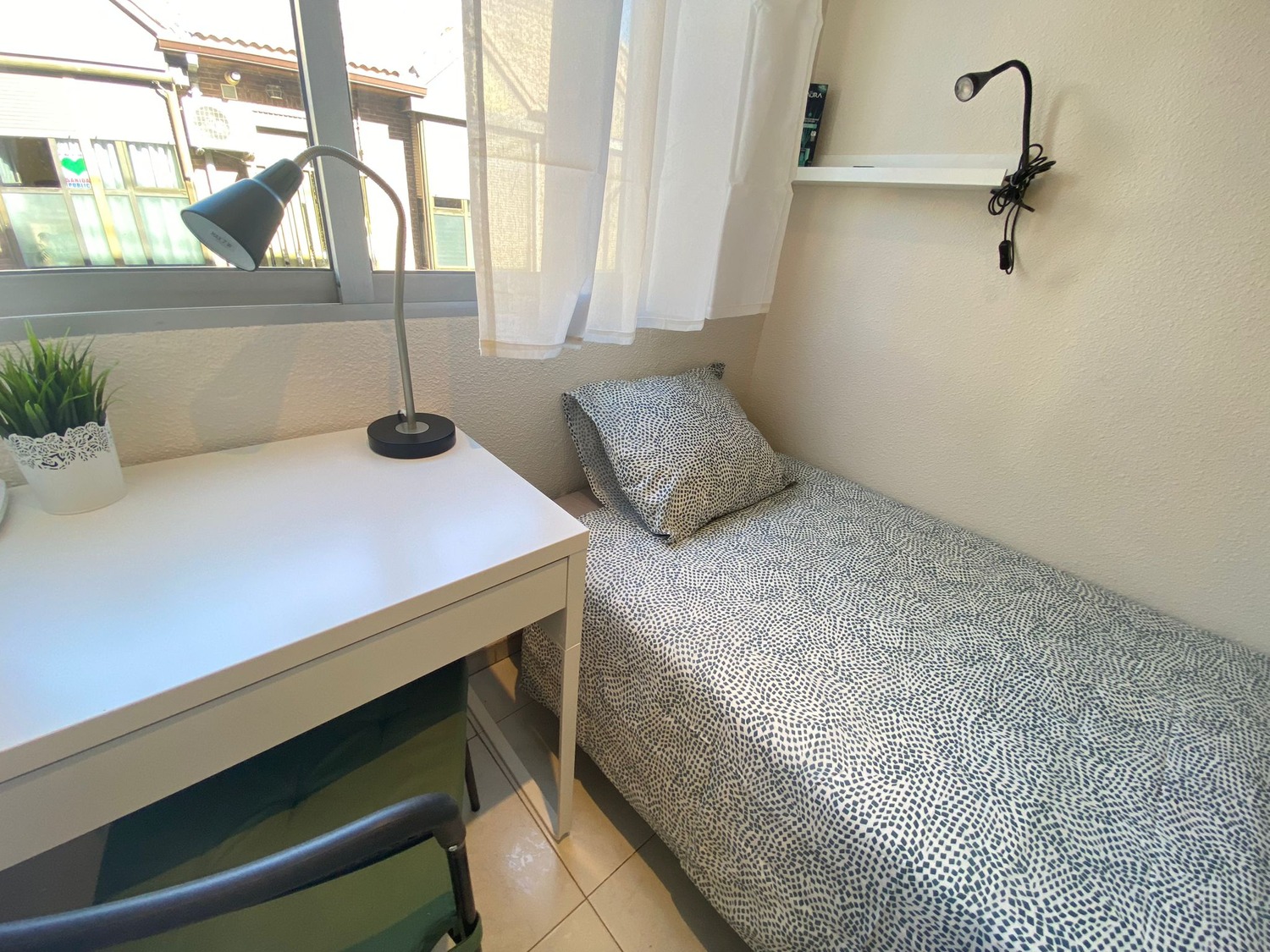 La habitación es de 8 m2, muy luminosa y perfectamente equipada con los siguientes complementos: 1 cama de 1.05 m con almohada, juego de sábanas y edredón, armario, escritorio con lámpara, silla y calefacción eléctrica.